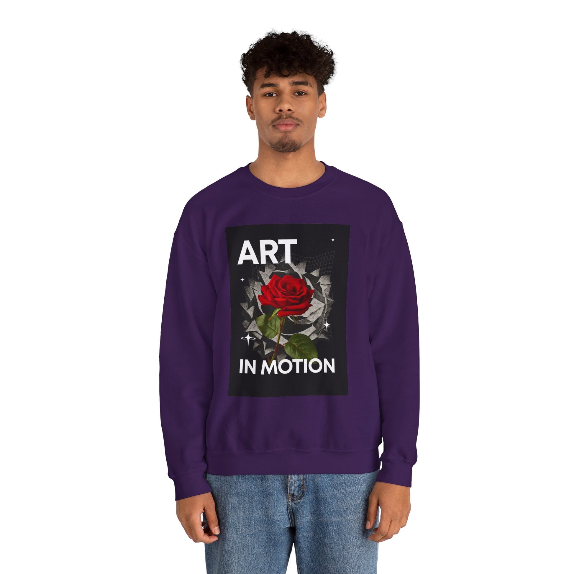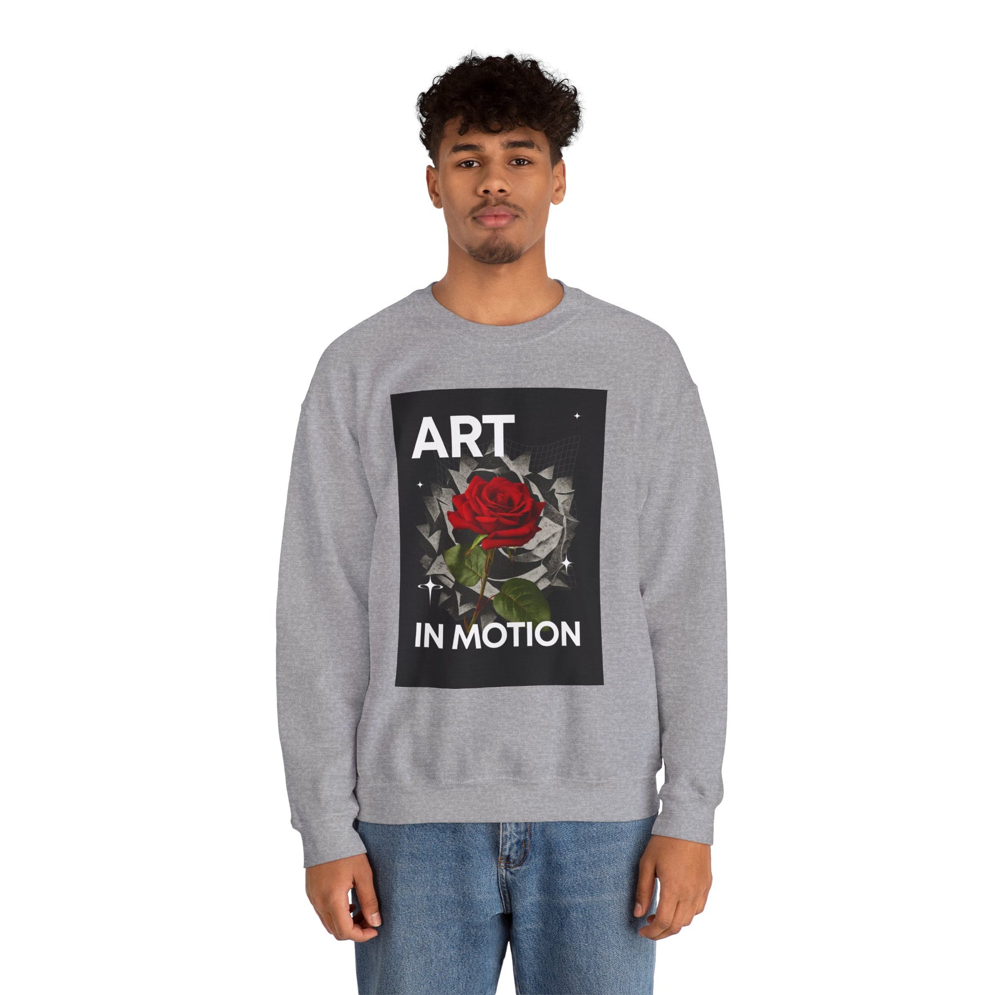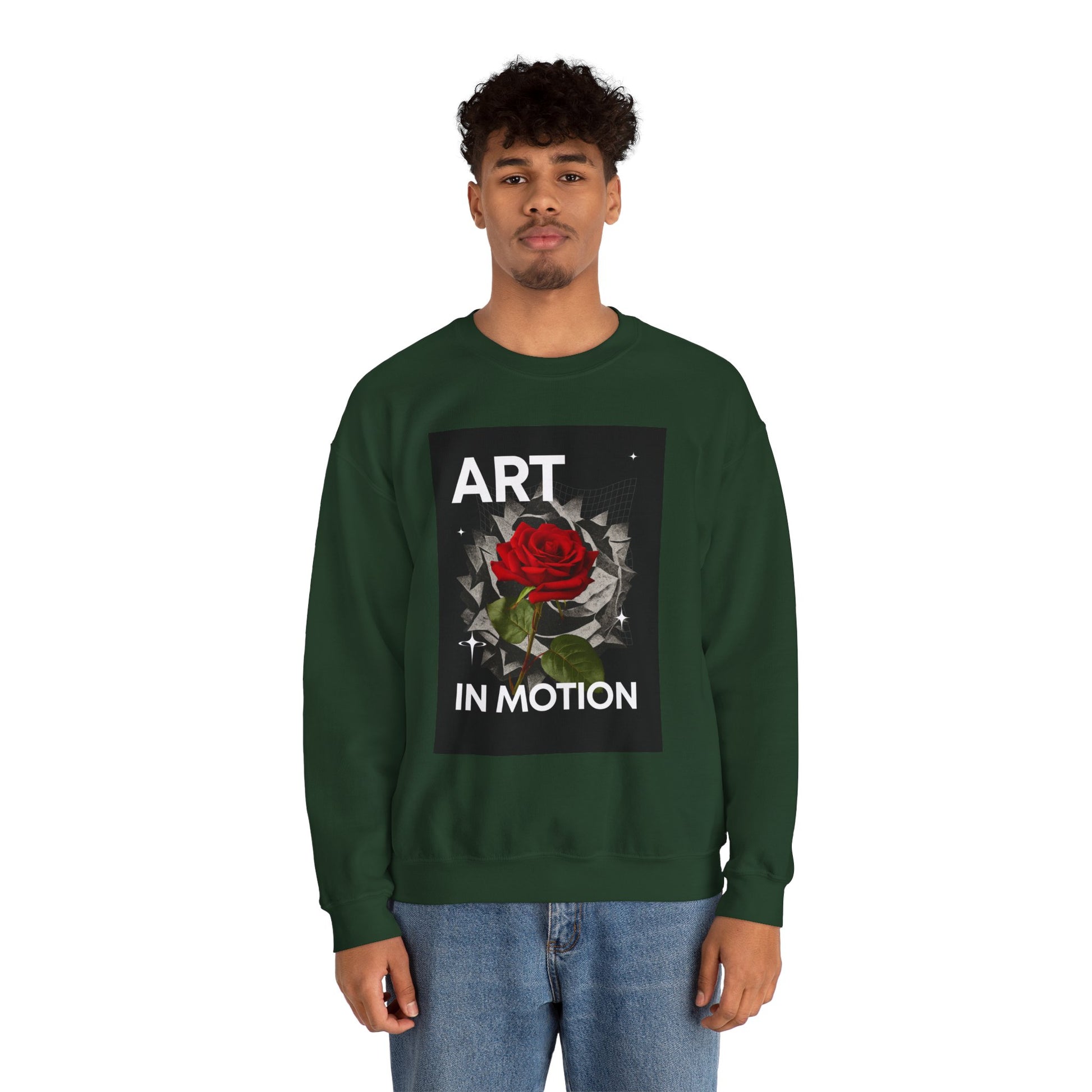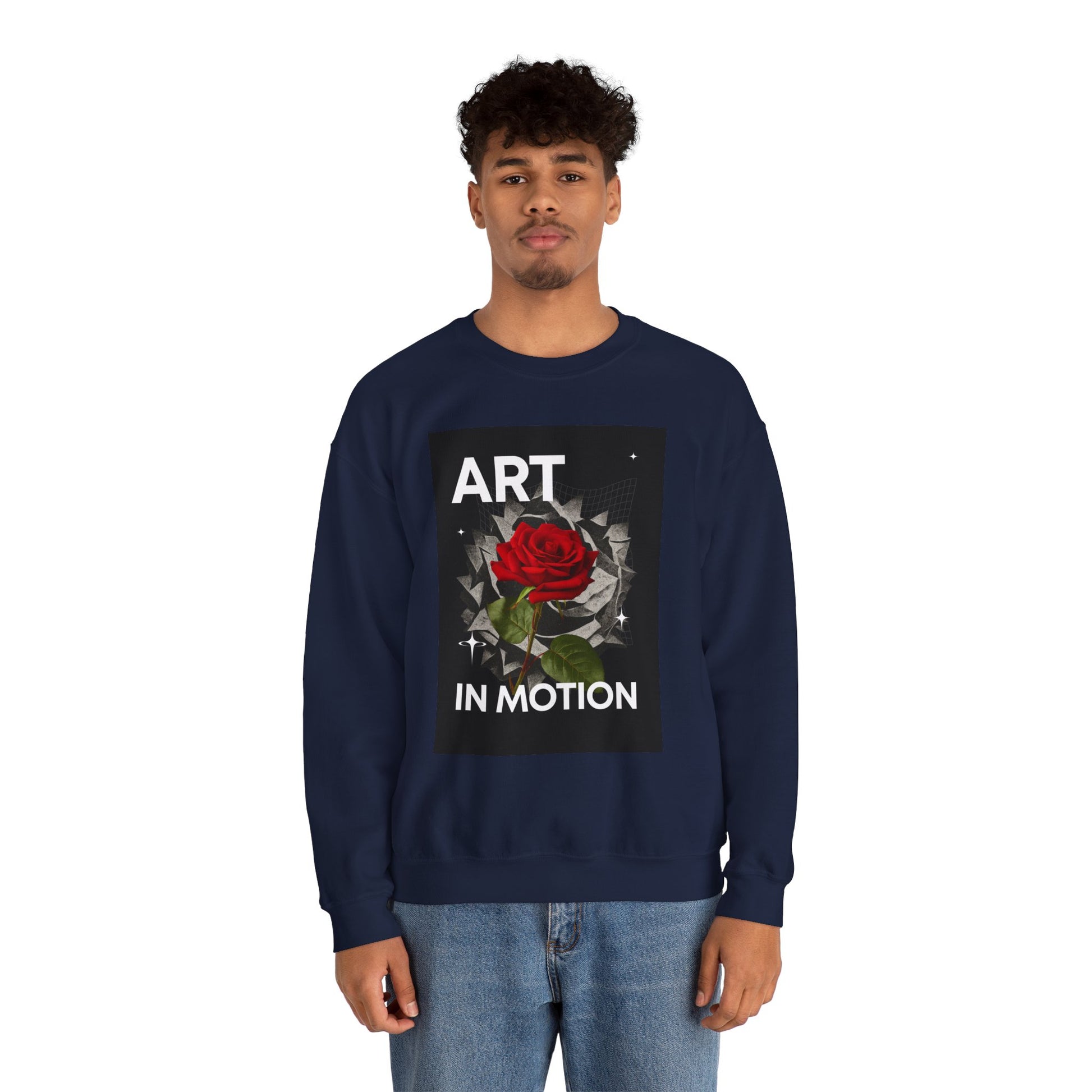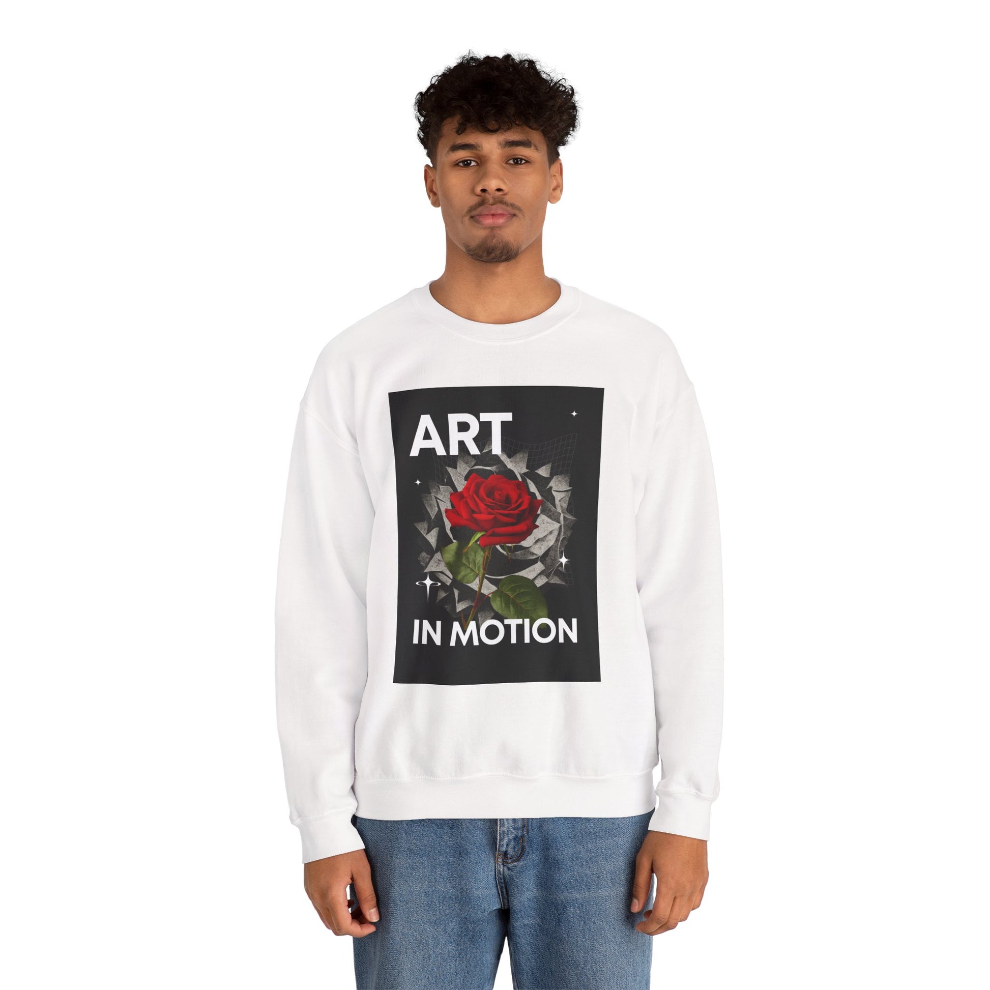 Soft, wearable art that carries a moment. This crewneck pairs a bold rectangular print — a single red rose breaking through folded paper with the phrase “ART IN MOTION” — with a clean white canvas. It feels calm and confident: warm enough for cool mornings, light enough for layered looks, and sturdy enough to travel with you through studio days and city walks. The design reads like a statement piece without shouting. Wear it when you want your outfit to speak for you — during gallery visits, late-night sketch sessions, or coffee runs where creativity follows you out the door.