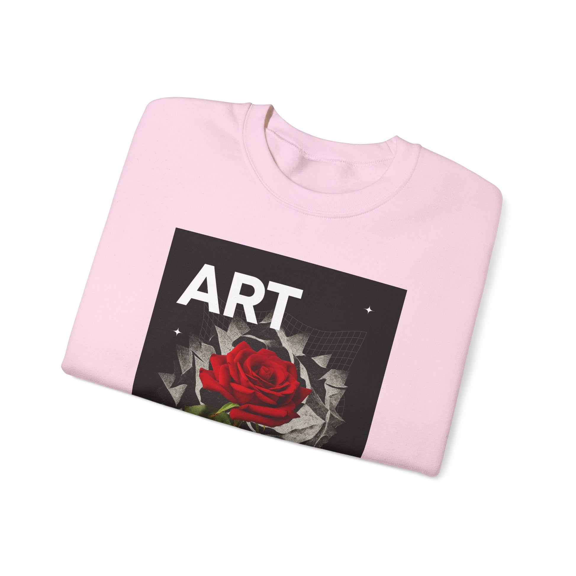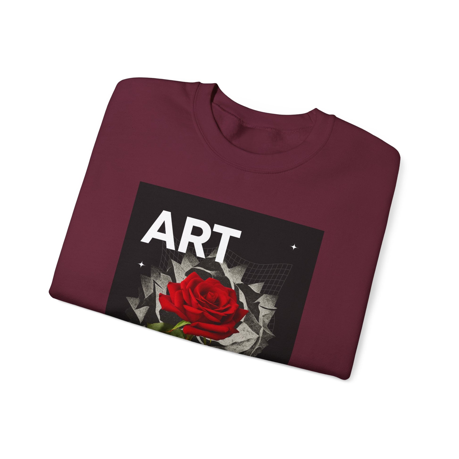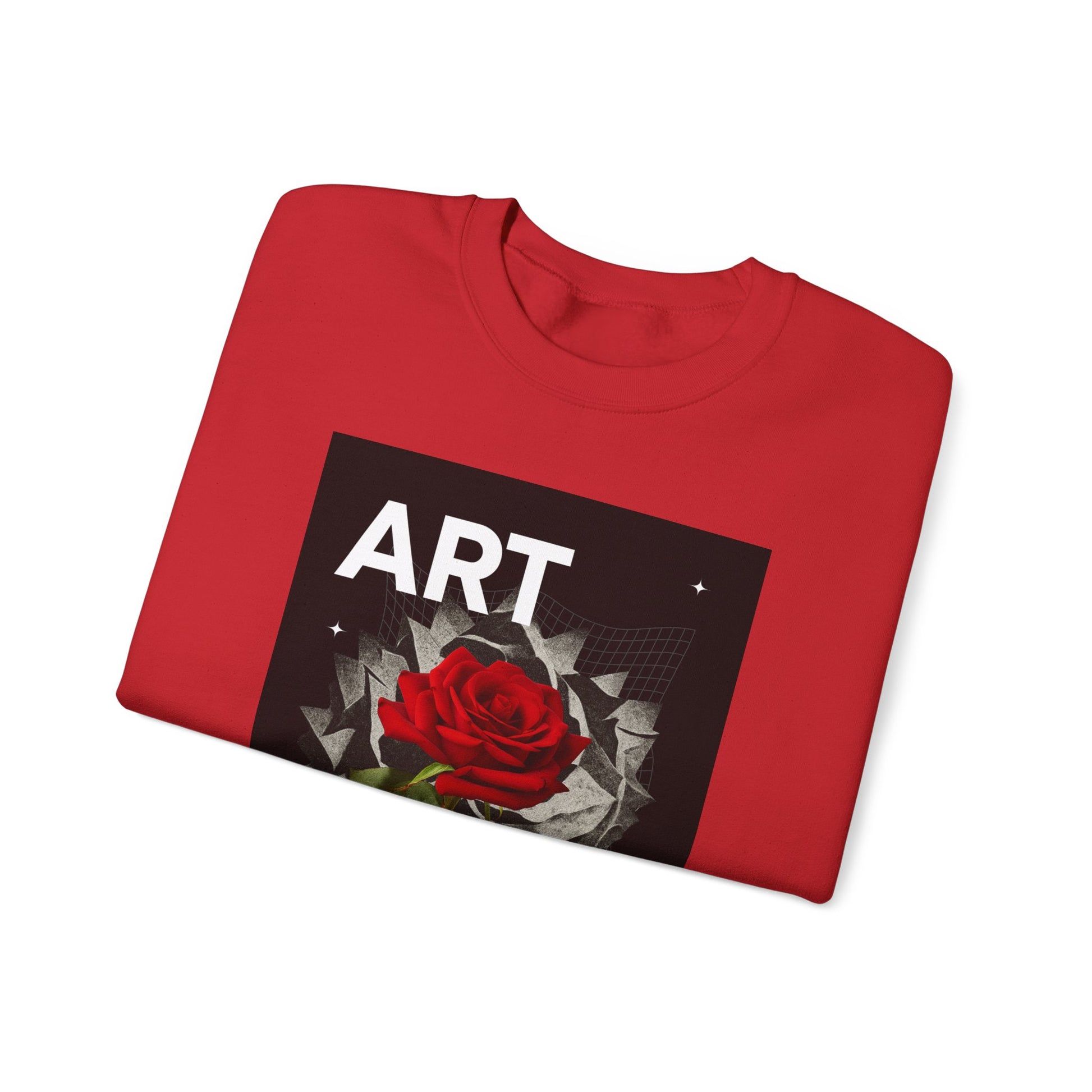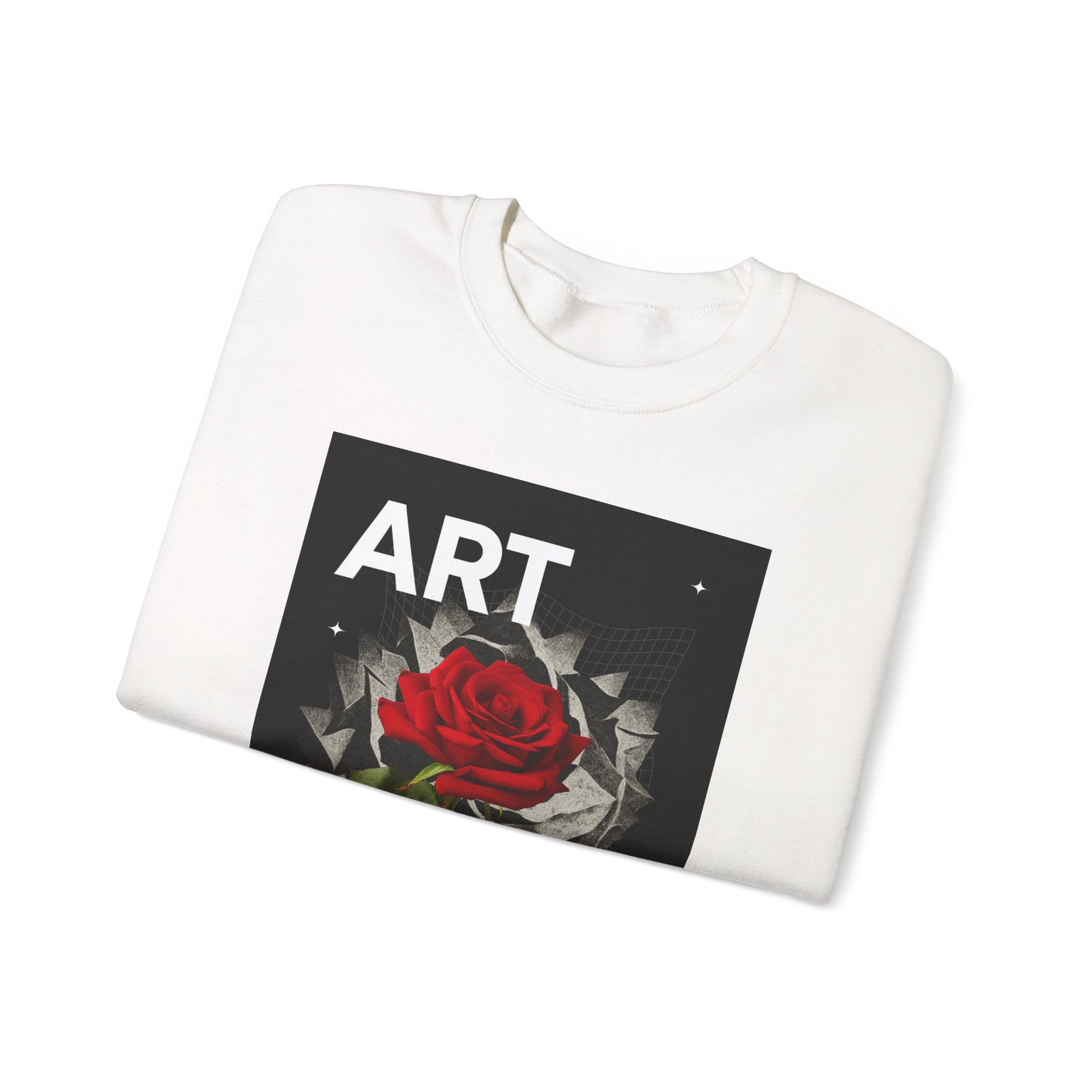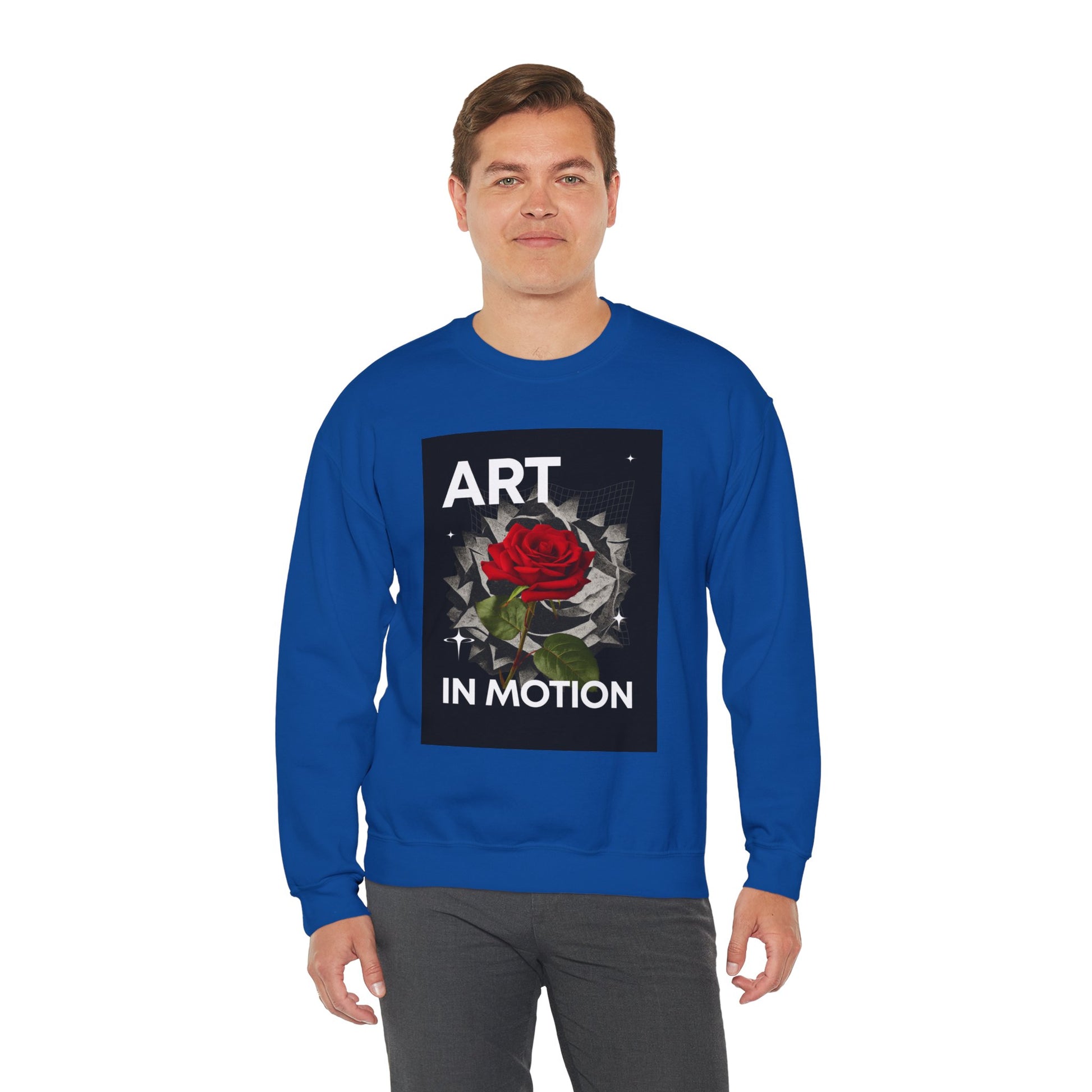 Soft, wearable art that carries a moment. This crewneck pairs a bold rectangular print — a single red rose breaking through folded paper with the phrase “ART IN MOTION” — with a clean white canvas. It feels calm and confident: warm enough for cool mornings, light enough for layered looks, and sturdy enough to travel with you through studio days and city walks. The design reads like a statement piece without shouting. Wear it when you want your outfit to speak for you — during gallery visits, late-night sketch sessions, or coffee runs where creativity follows you out the door.