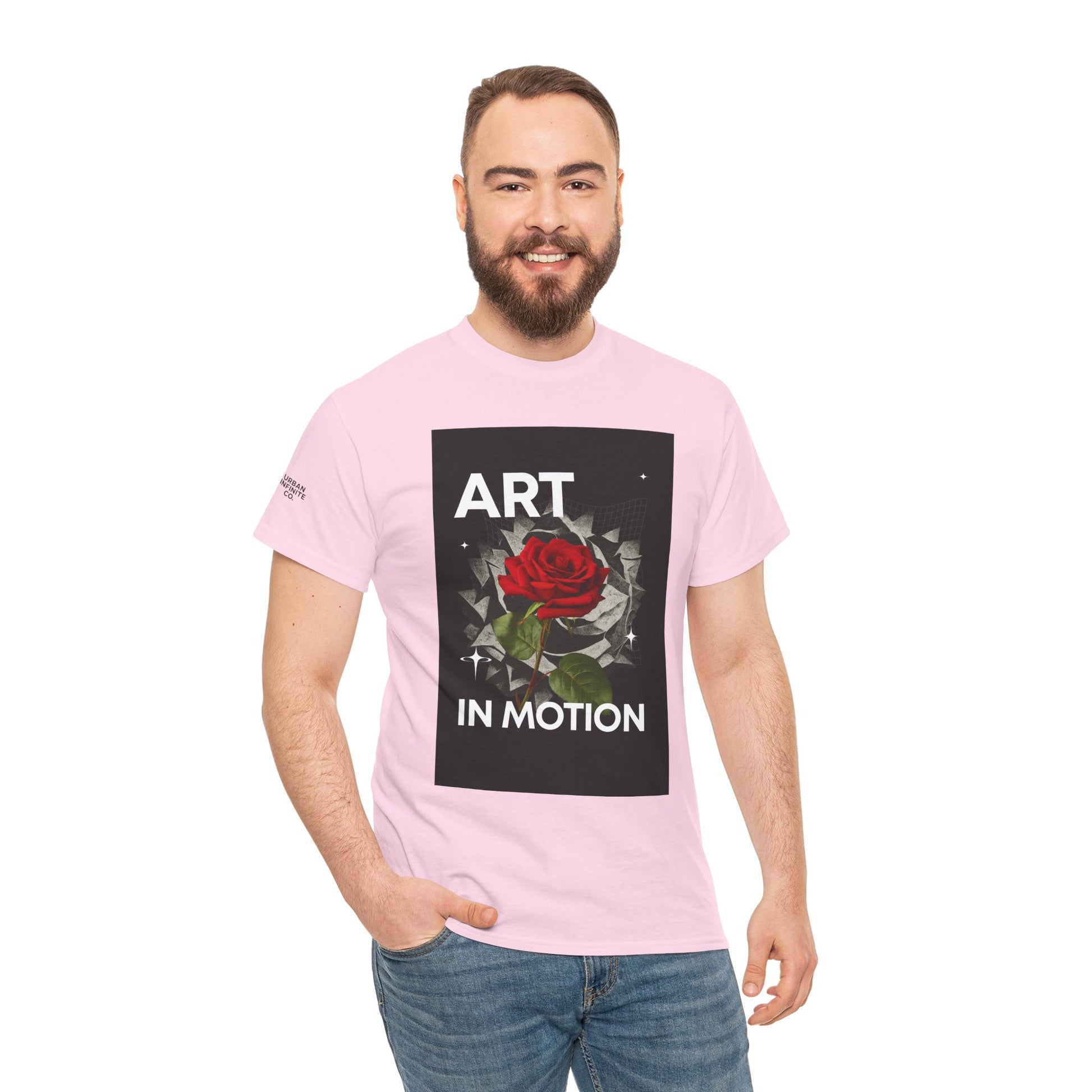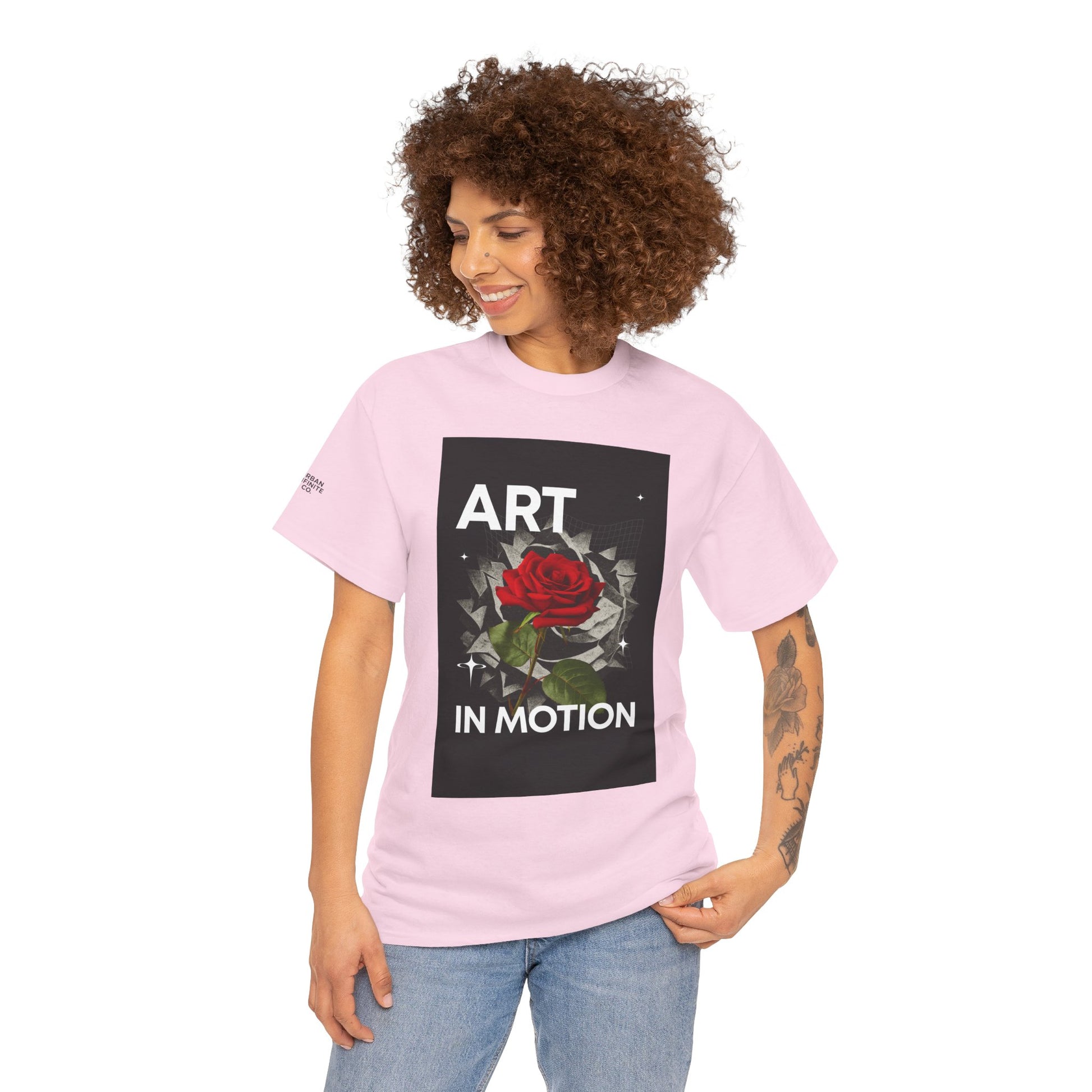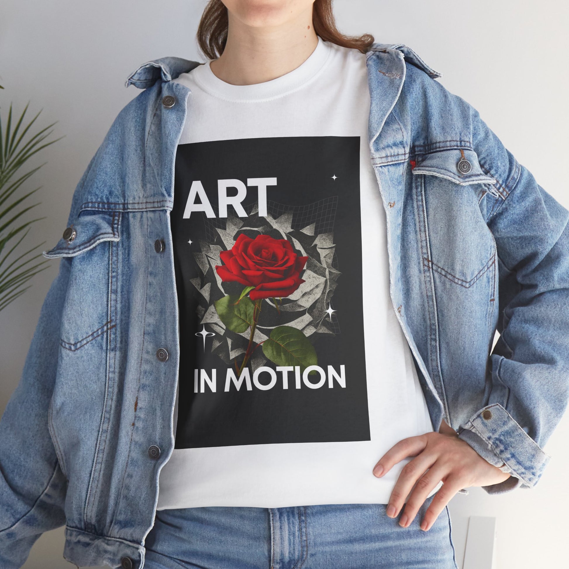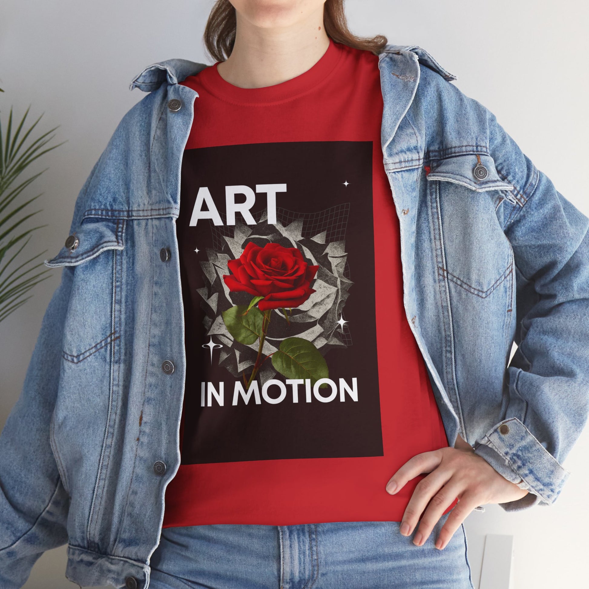 This tee carries a quiet, artful confidence — a single red rose unfolding against a fractured, kinetic background with the words “ART IN MOTION.” It feels like a gallery piece you can wear: bold typography and painterly detail meet everyday comfort. Lightweight yet sturdy cotton sits close to the body with a classic crew neck, so the design becomes the focal point whether you’re wandering a city exhibit, sketching in a café, or layering for a night out. The vibe is creative, thoughtful, and slightly rebellious — for people who move through life making and noticing moments.