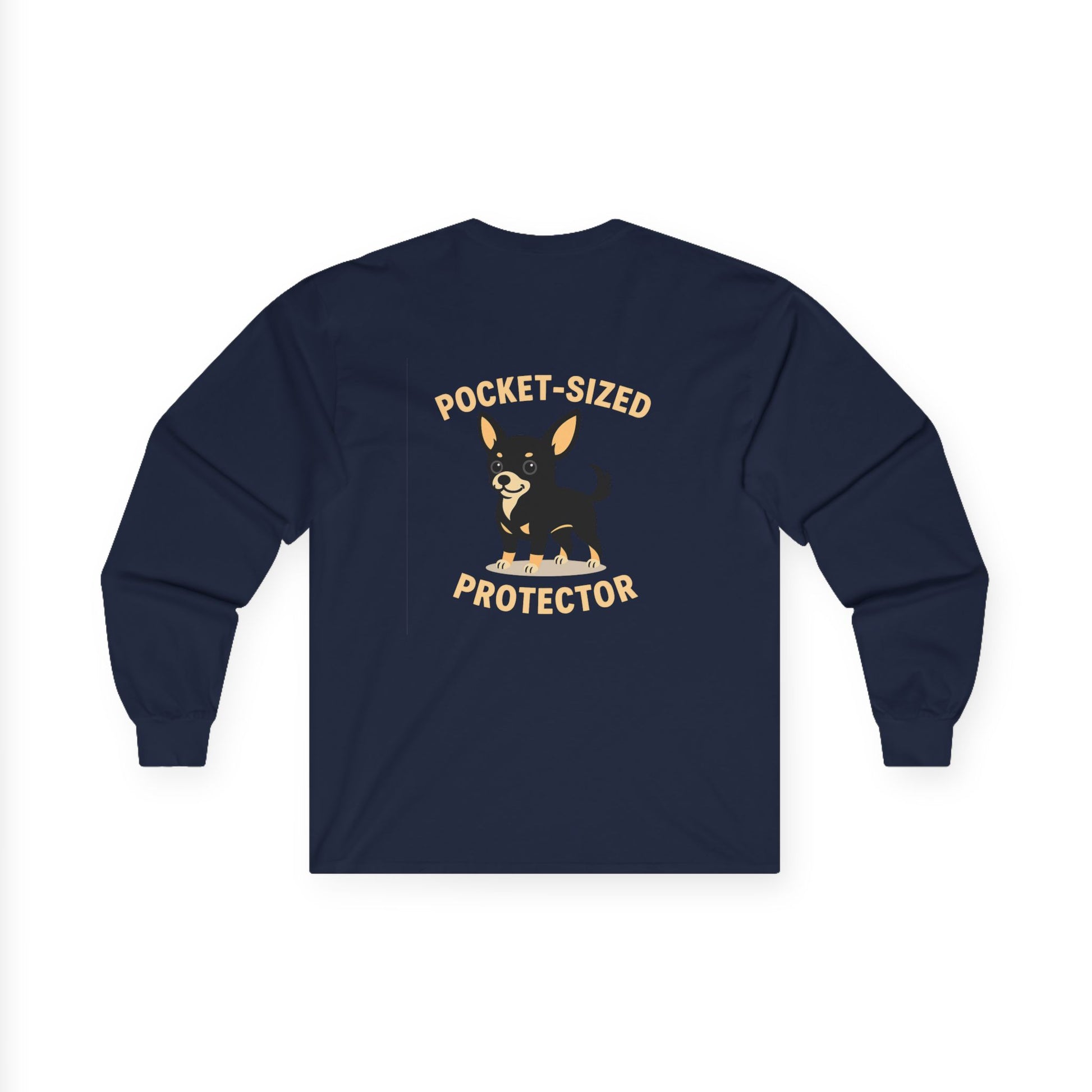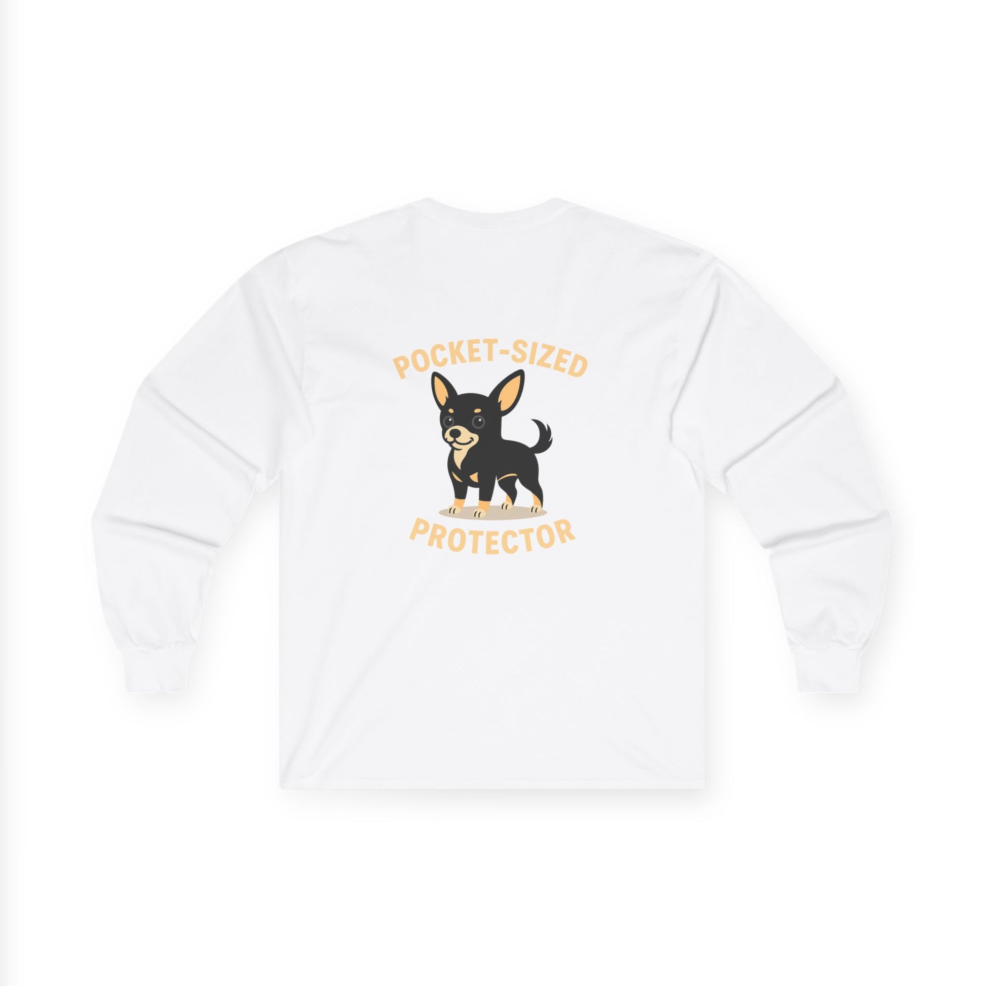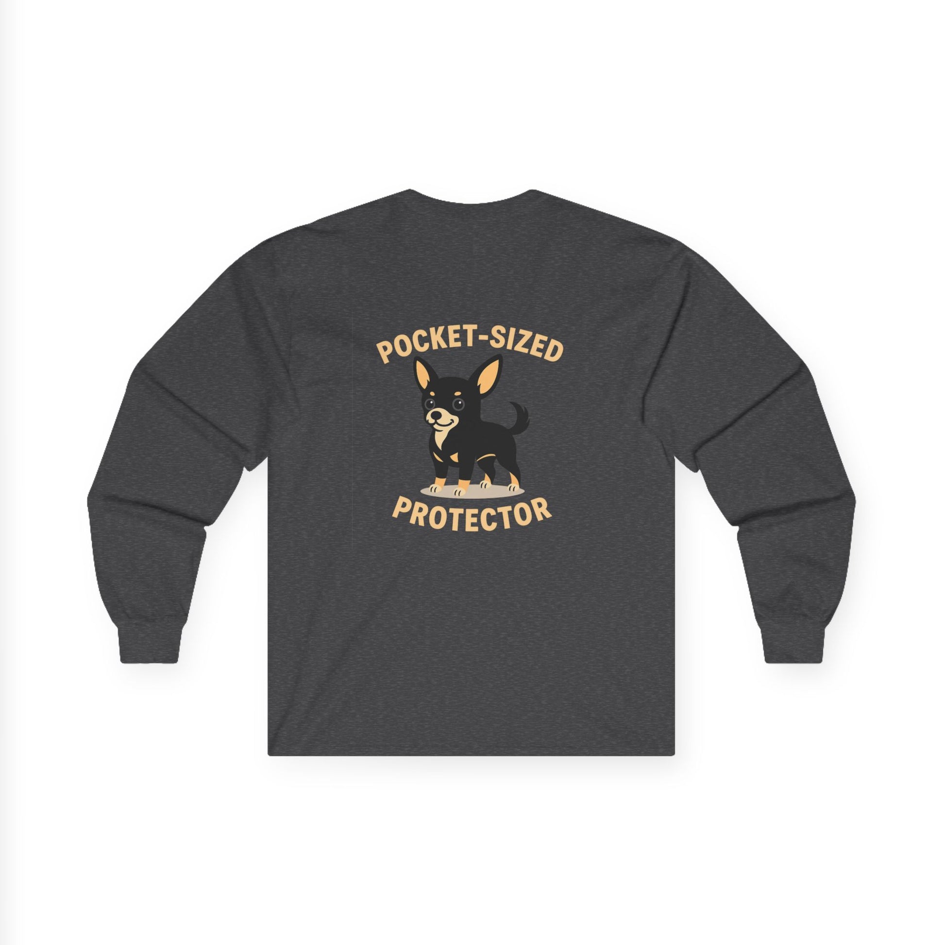 Soft, lived-in long sleeve that feels like a quiet Sunday morning with your little guardian at your feet. This classic-fit tee carries a playful ‘Pocket-Sized Protector’ illustration—bold on the back, subtle chest mark up front—that nods to fierce-small dogs and their oversized personalities. The medium-weight cotton holds its shape while offering that slightly vintage drape. Wear it on walks, at the dog park, or while lounging at home; the ribbed collar and taped shoulders keep the silhouette tidy after many wears. Runs a touch small—size up if you prefer room to move.