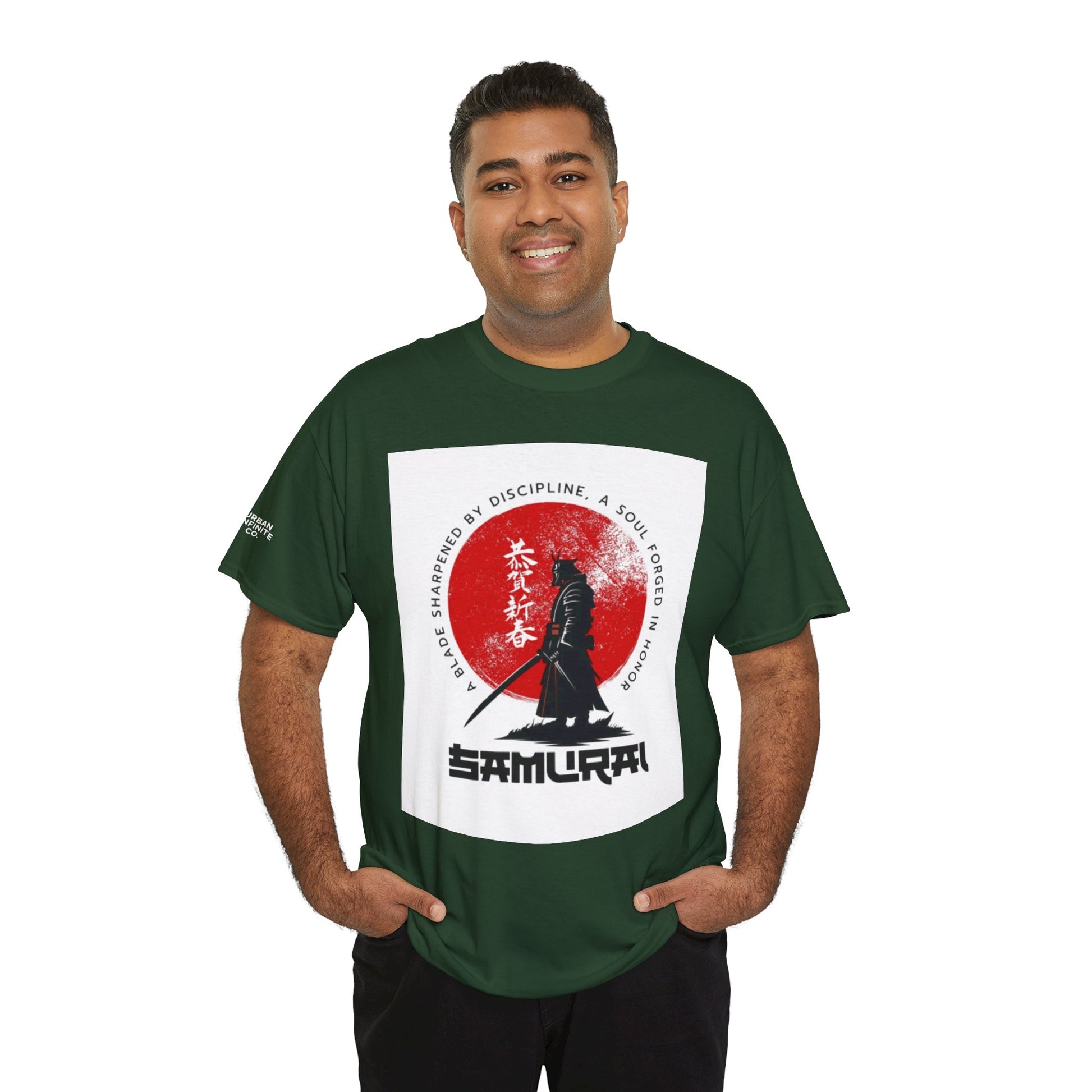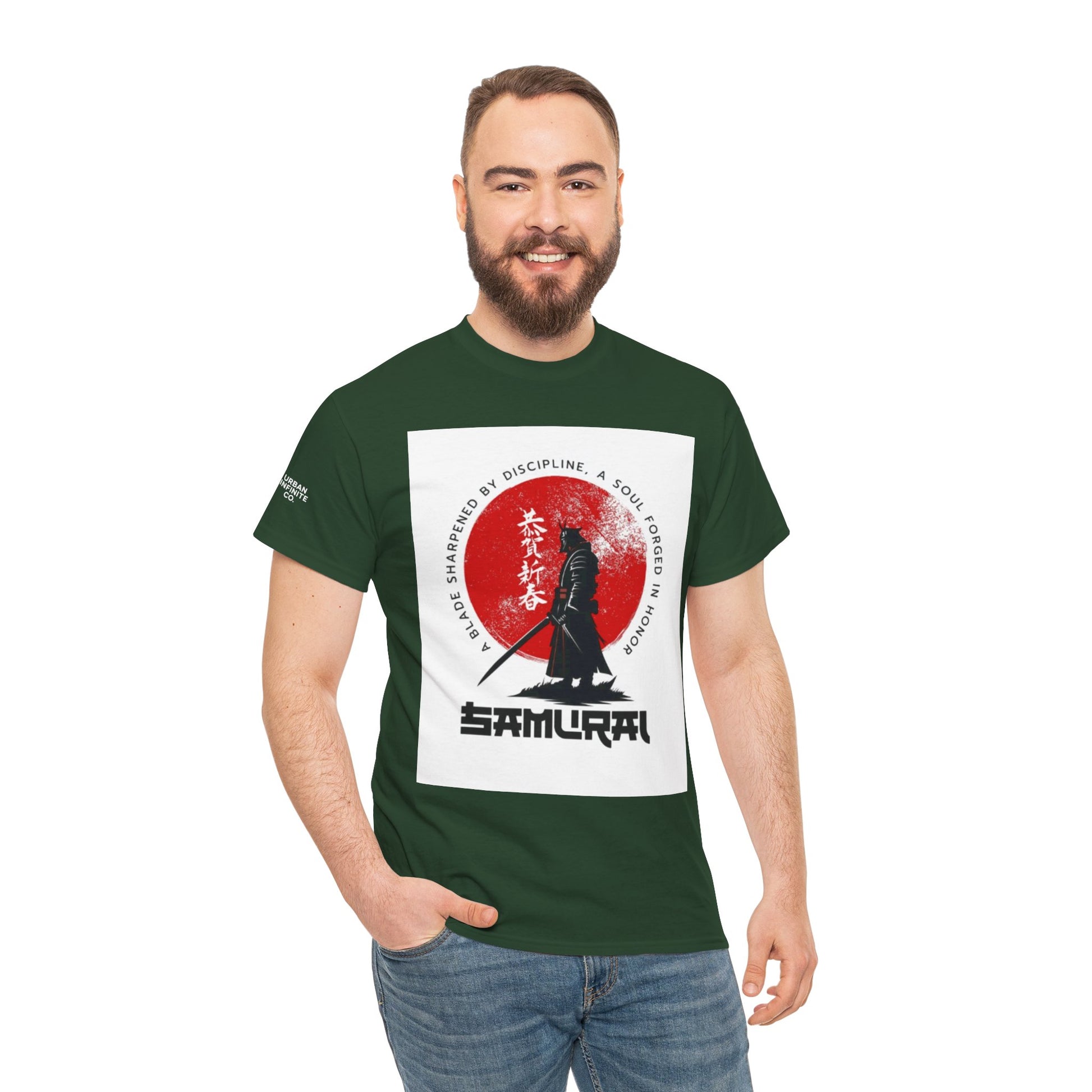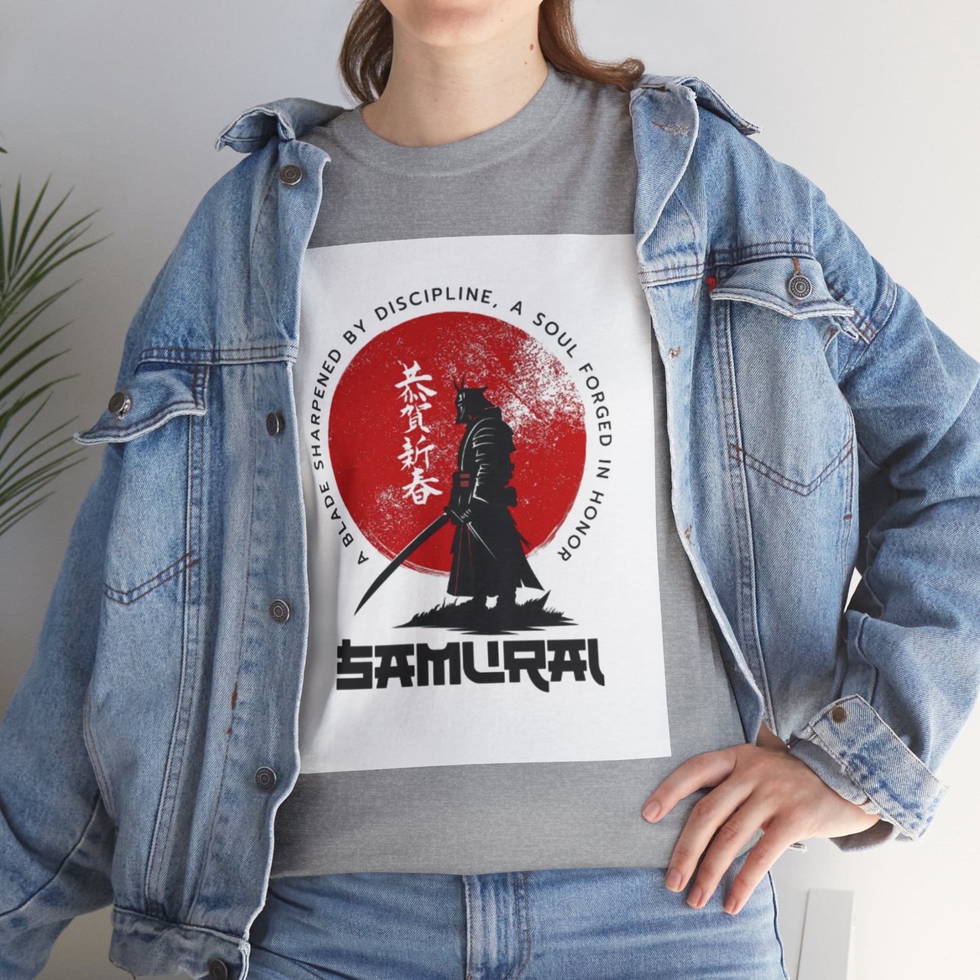 A timeless, confidence-evoking tee that channels the calm focus of a lone warrior. The shirt features a bold crimson sun backdrop with a silhouetted samurai in mid-stance, Japanese characters, and weathered brush textures that give it an authentic, hand-painted feel. Lightweight yet sturdy, the fabric sits comfortably against the skin while the classic crew neck and relaxed fit let the design take center stage. Wear it with worn denim, layered under an open jacket, or paired with joggers for a quiet, purposeful look that speaks to discipline and inner strength.