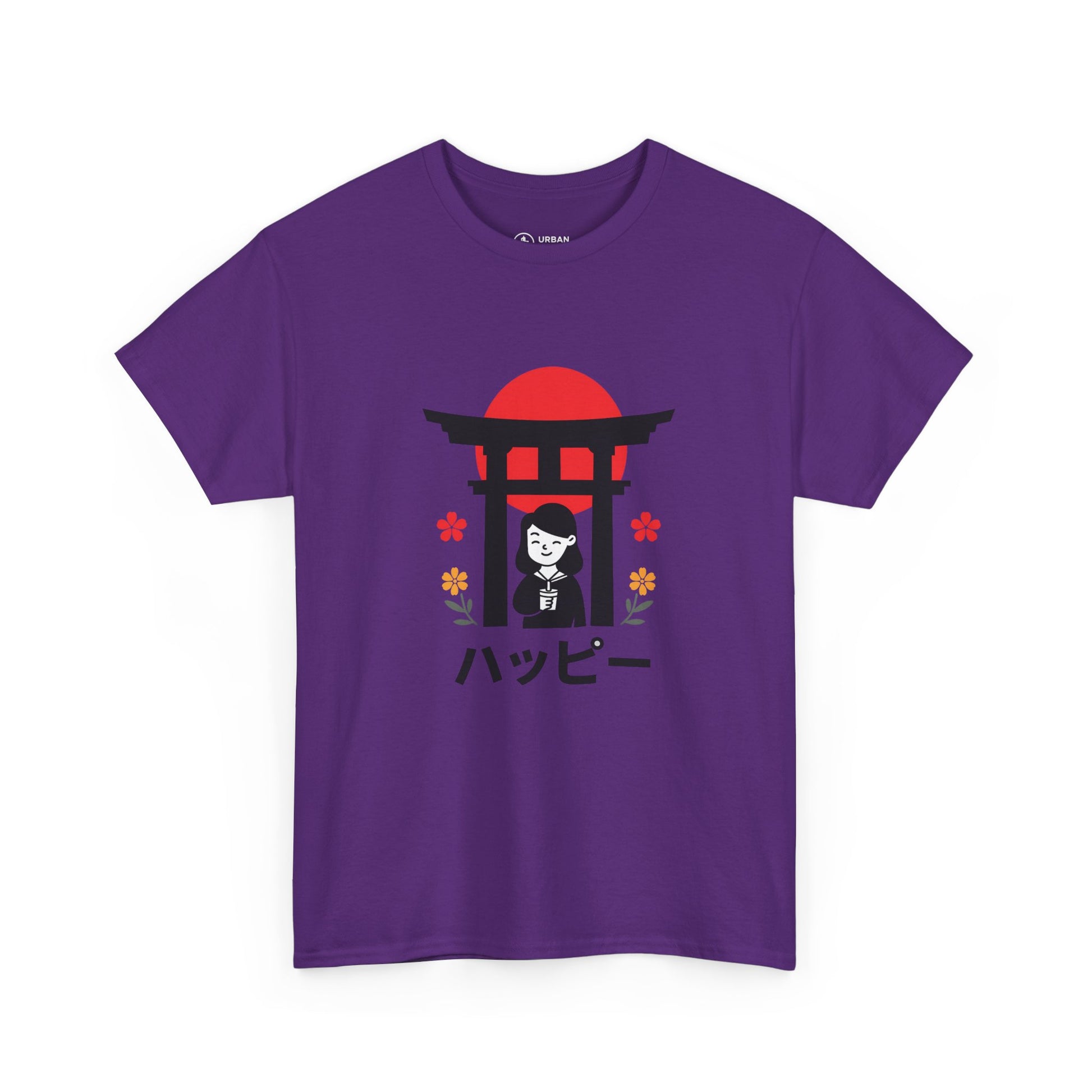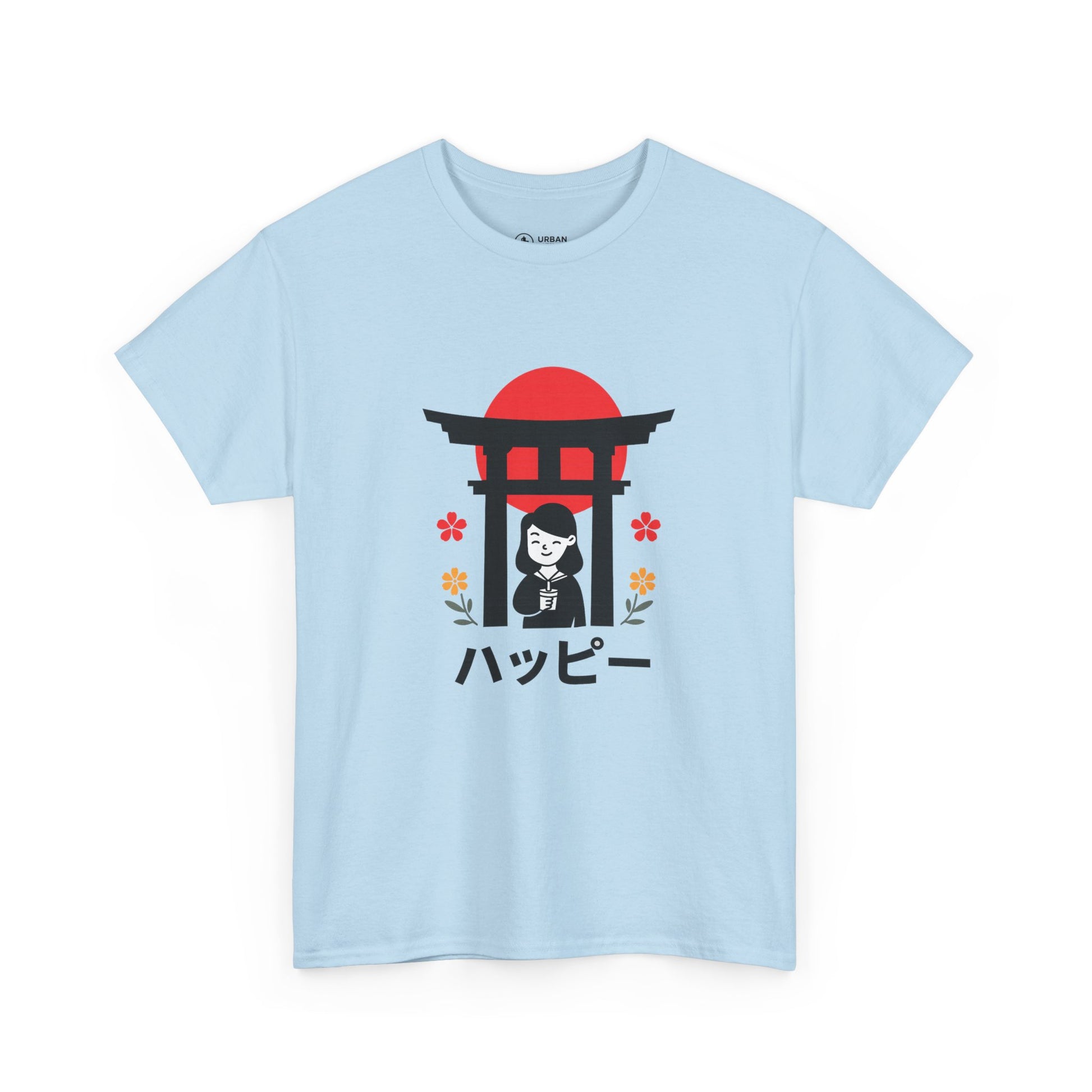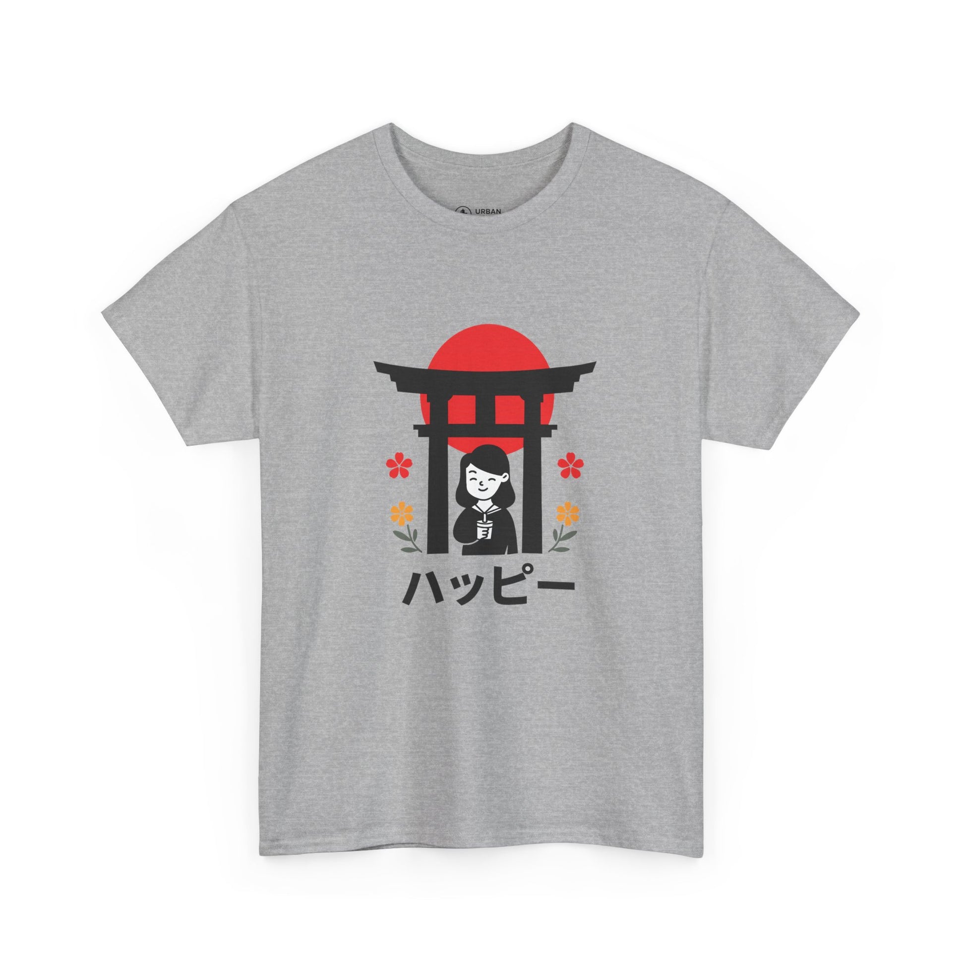 This soft, classic-fit tee carries a quiet, joyful vibe inspired by simple Japanese motifs. A small torii gate silhouettes a smiling figure beneath a rising-red sun, with tiny floral accents and the word “ハッピー” meaning (happy) beneath — a subtle, cheerful statement that reads like a moment caught on a stroll through a shrine garden. The medium-weight cotton holds its shape and print detail nicely, so the graphic stays crisp wash after wash. Wear it to bring a lighthearted, peaceful energy to everyday routines — layered under a jacket for city walks or paired with relaxed denim for weekend calm.