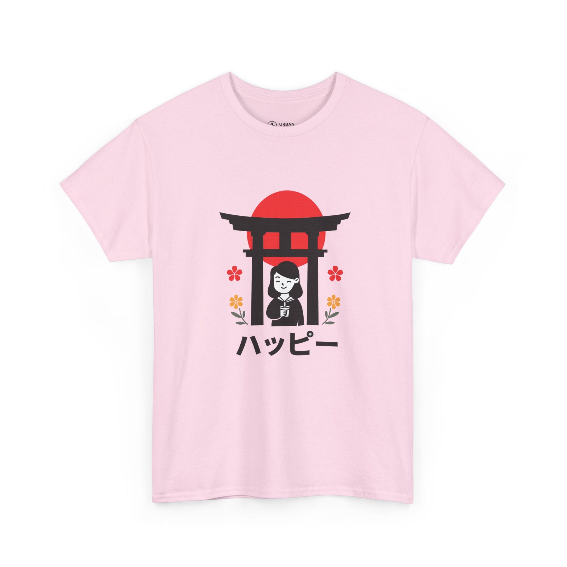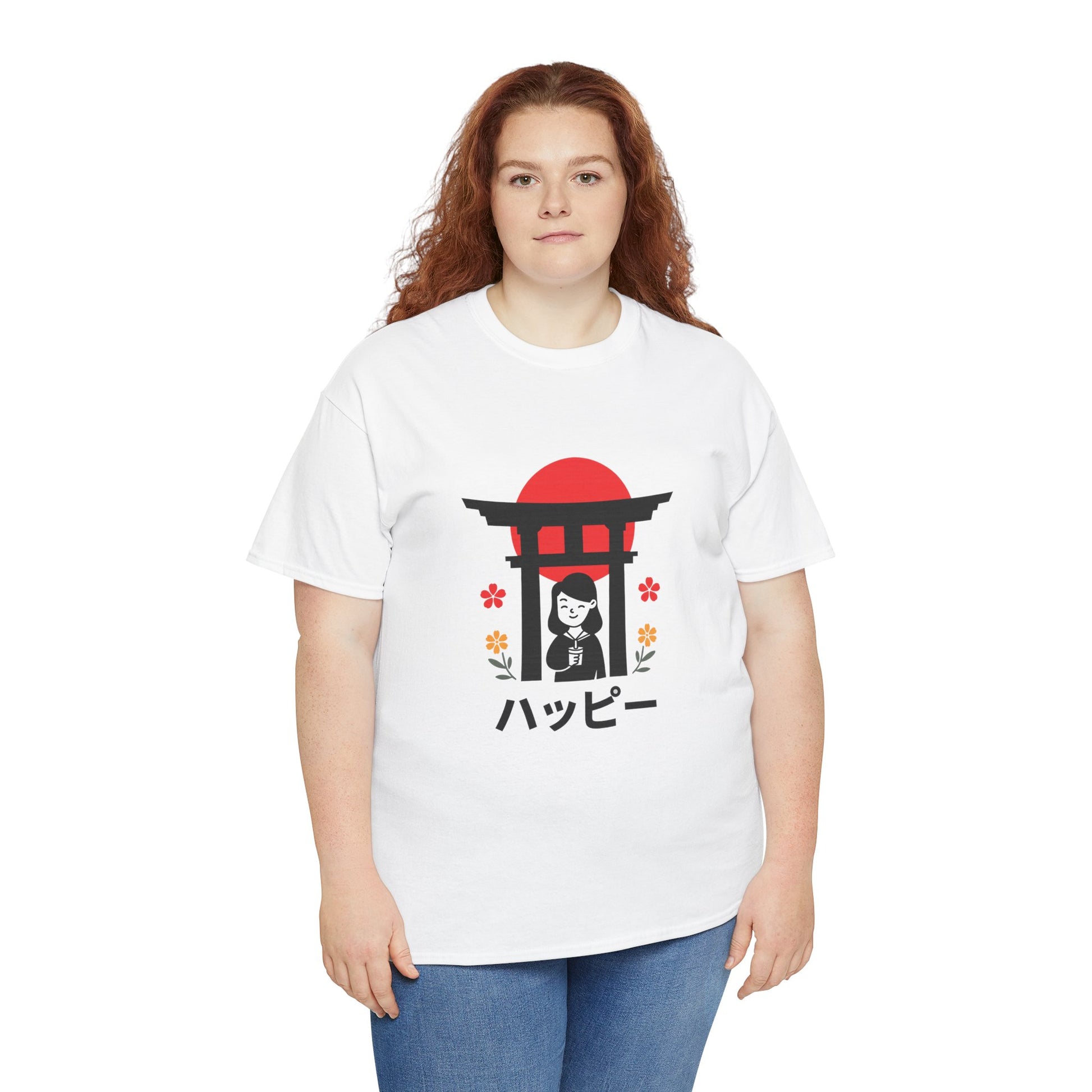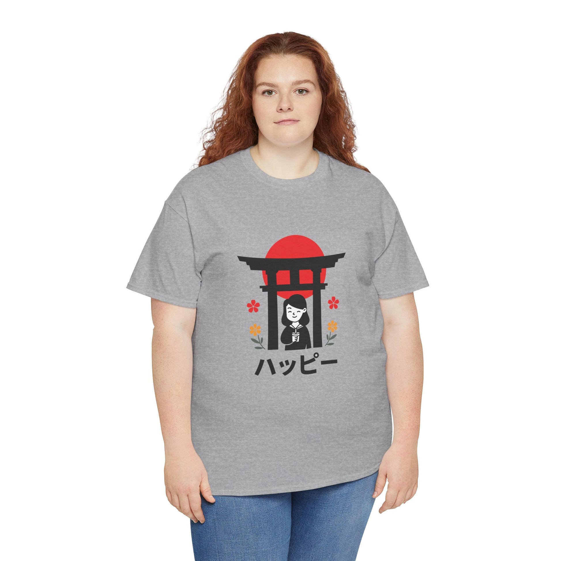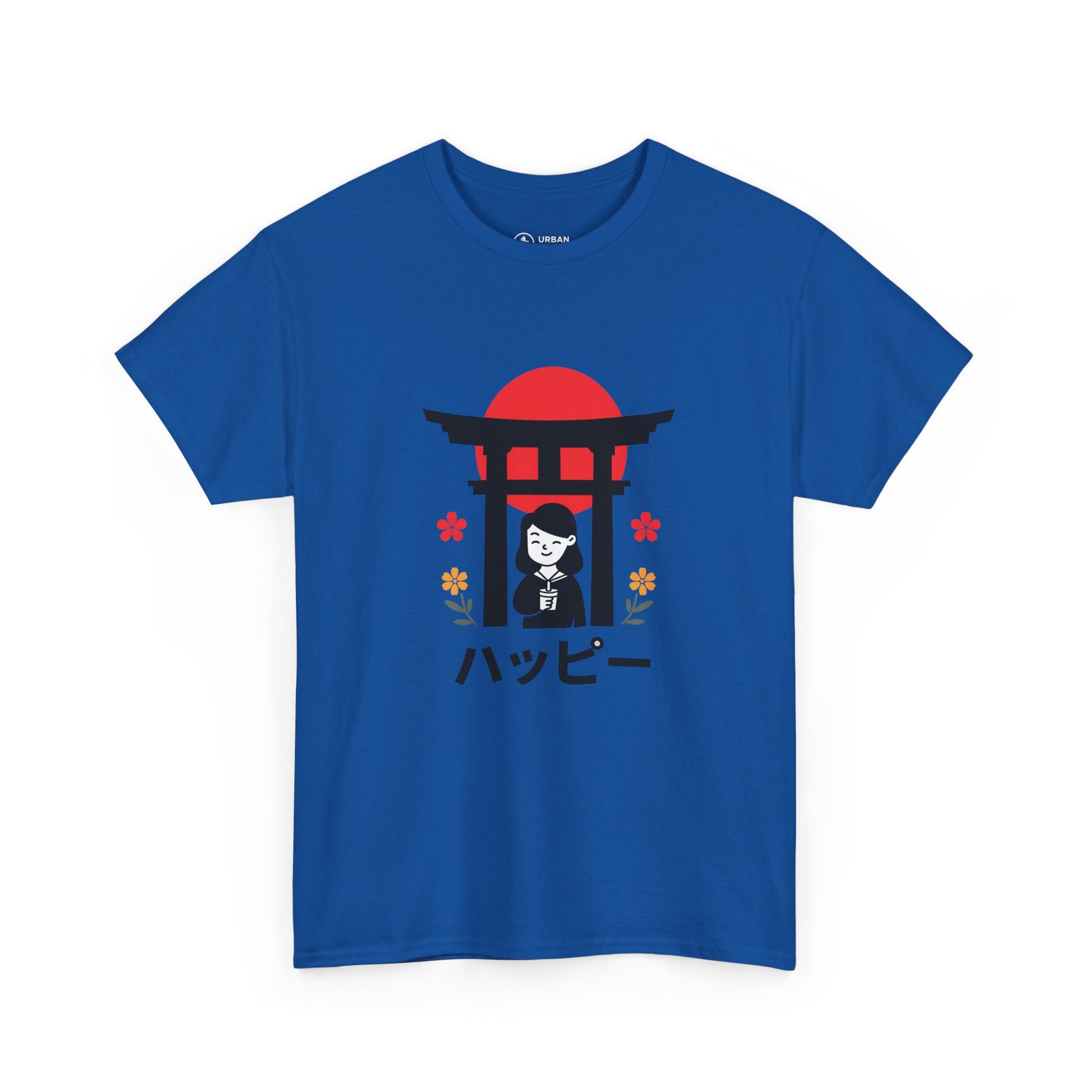 This soft, classic-fit tee carries a quiet, joyful vibe inspired by simple Japanese motifs. A small torii gate silhouettes a smiling figure beneath a rising-red sun, with tiny floral accents and the word “ハッピー” meaning (happy) beneath — a subtle, cheerful statement that reads like a moment caught on a stroll through a shrine garden. The medium-weight cotton holds its shape and print detail nicely, so the graphic stays crisp wash after wash. Wear it to bring a lighthearted, peaceful energy to everyday routines — layered under a jacket for city walks or paired with relaxed denim for weekend calm.