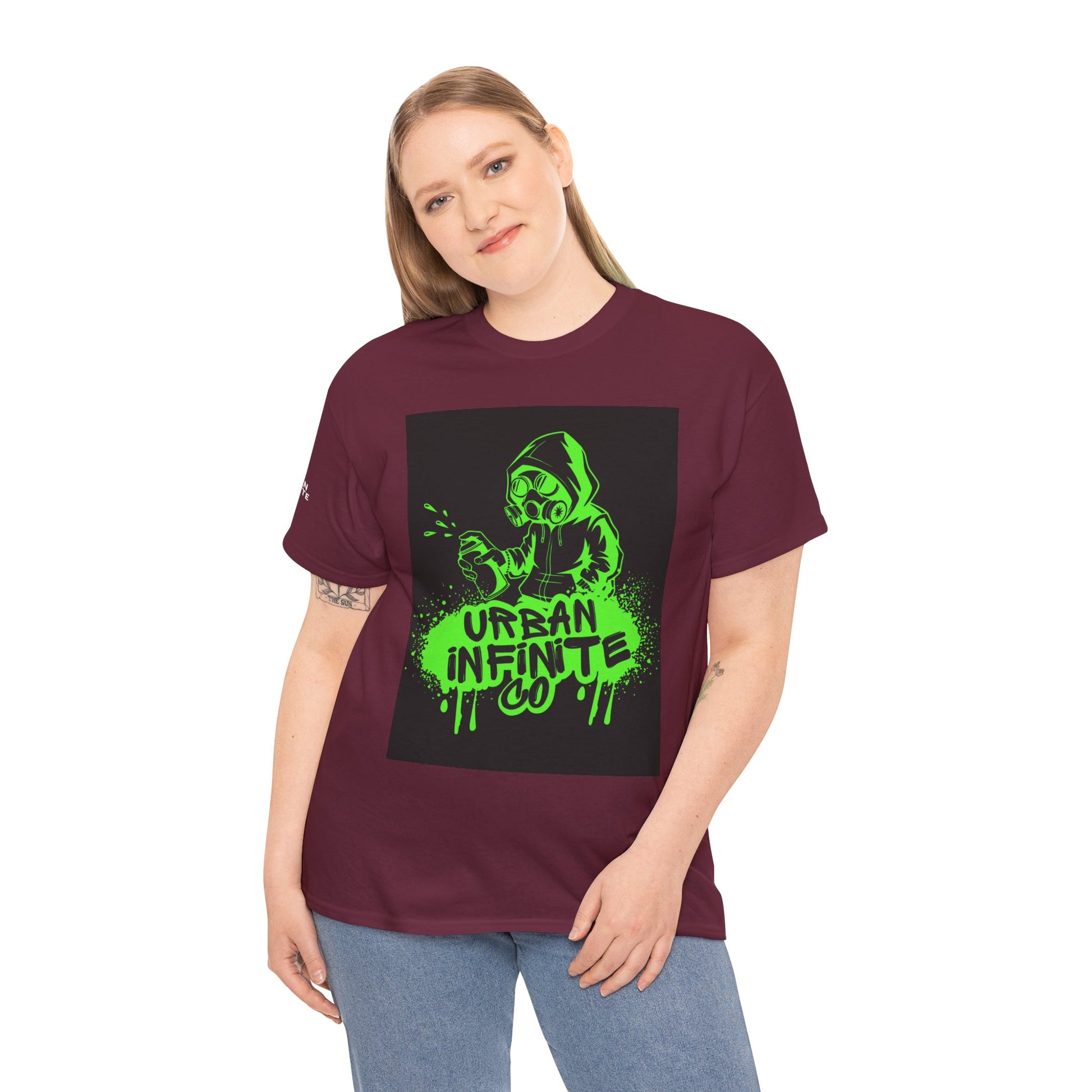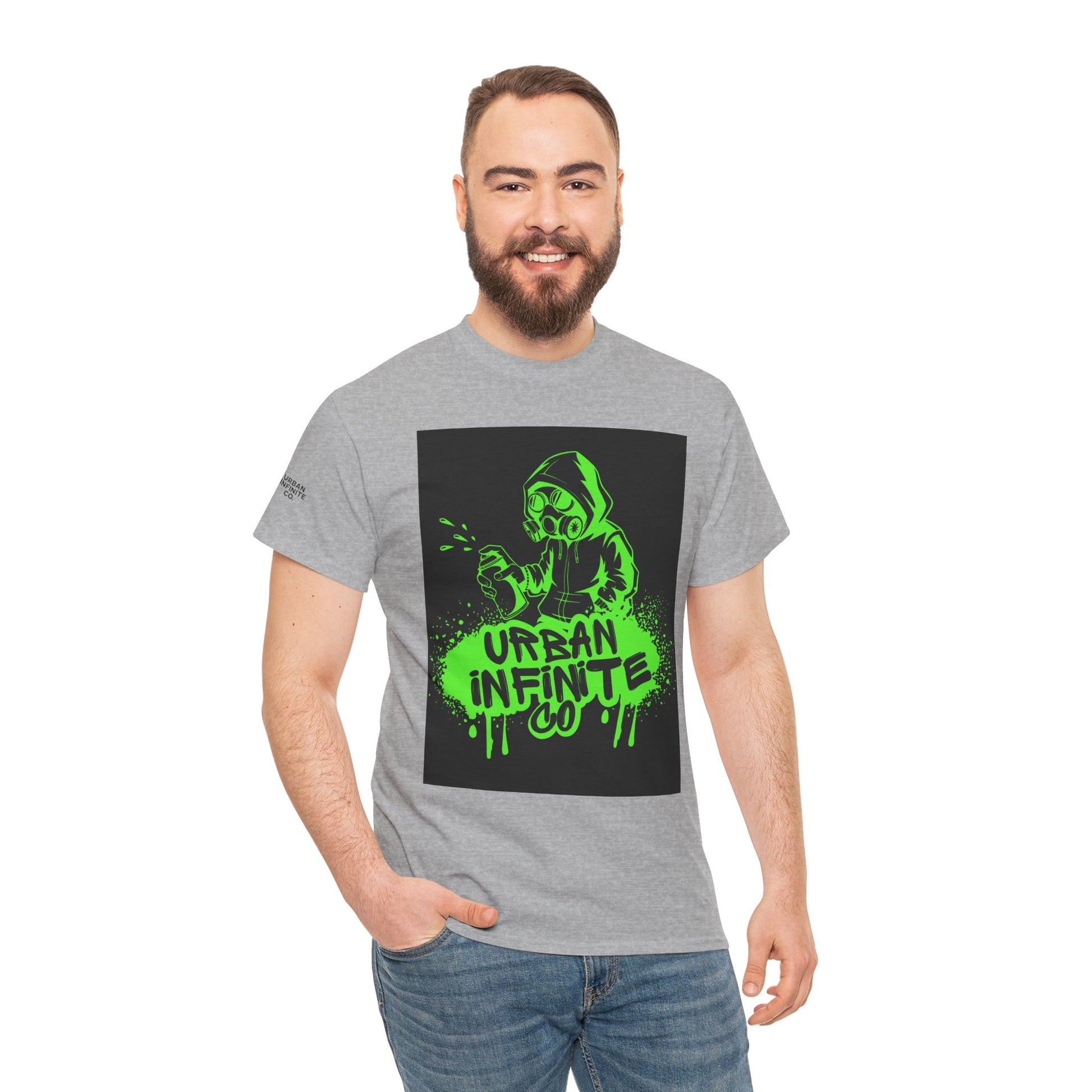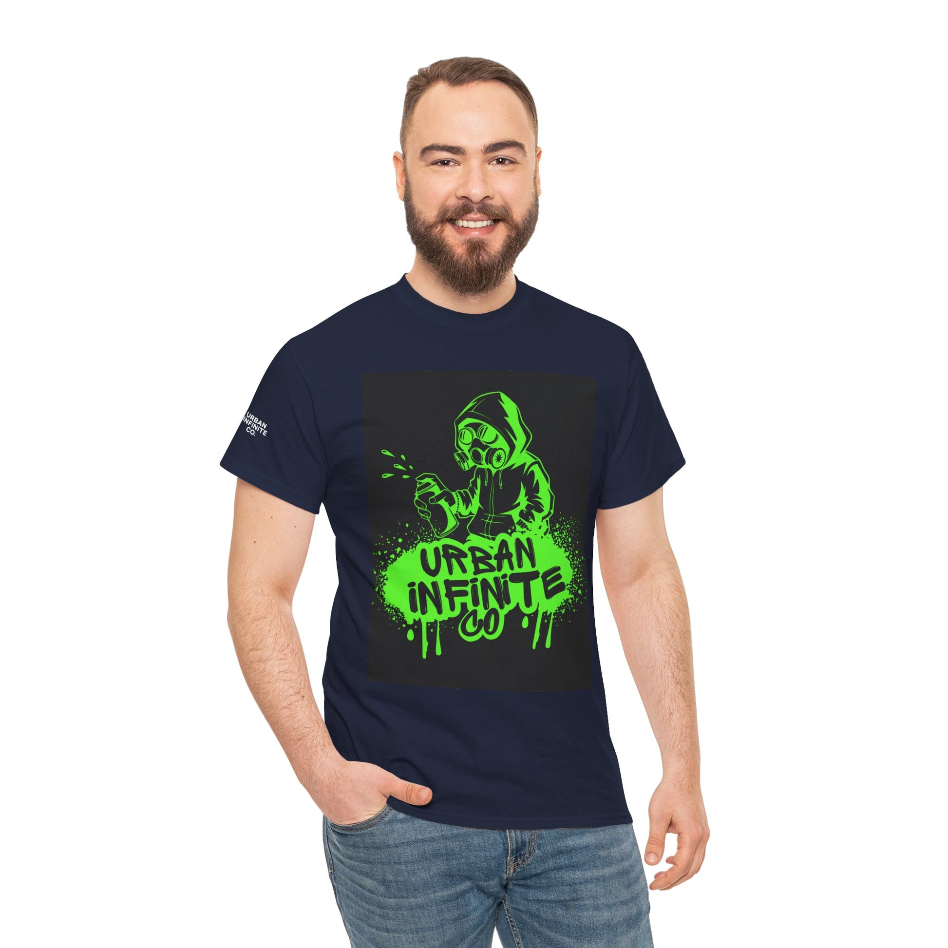 A bold, streetwise tee that speaks in neon. The crisp white cotton holds a high-contrast graphic: a hooded figure spraying vivid green graffiti that reads “Urban Infinite Co.” It feels like a late-night city pulse — the hiss of a can, wet paint dripping down brick, adrenaline and creativity in one frame. Wear it to stake your claim on skate spots, to add attitude under a denim jacket, or to stand out at underground art nights. The medium-weight fabric and relaxed crew fit let the design do the talking while staying comfortable through long days and late sessions.