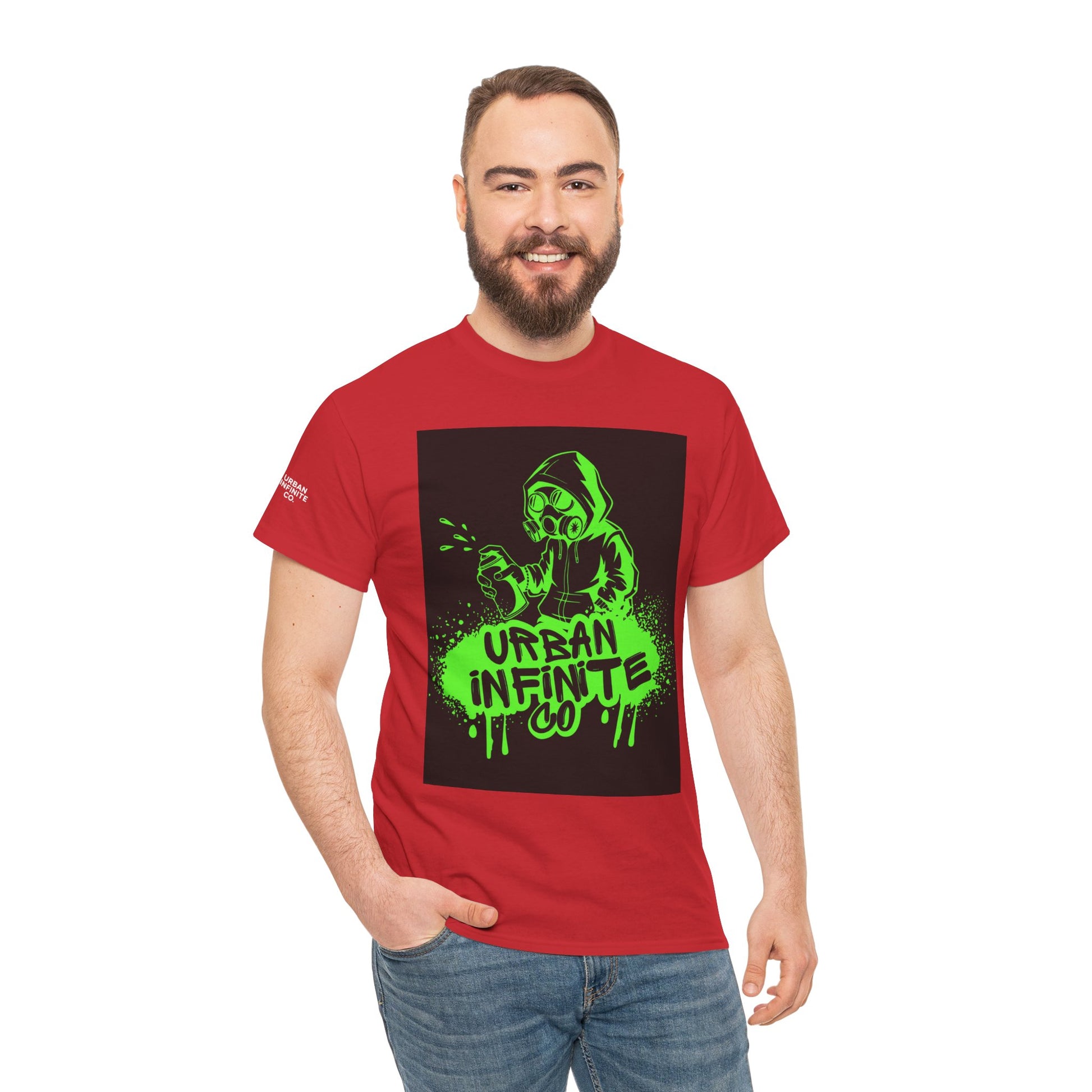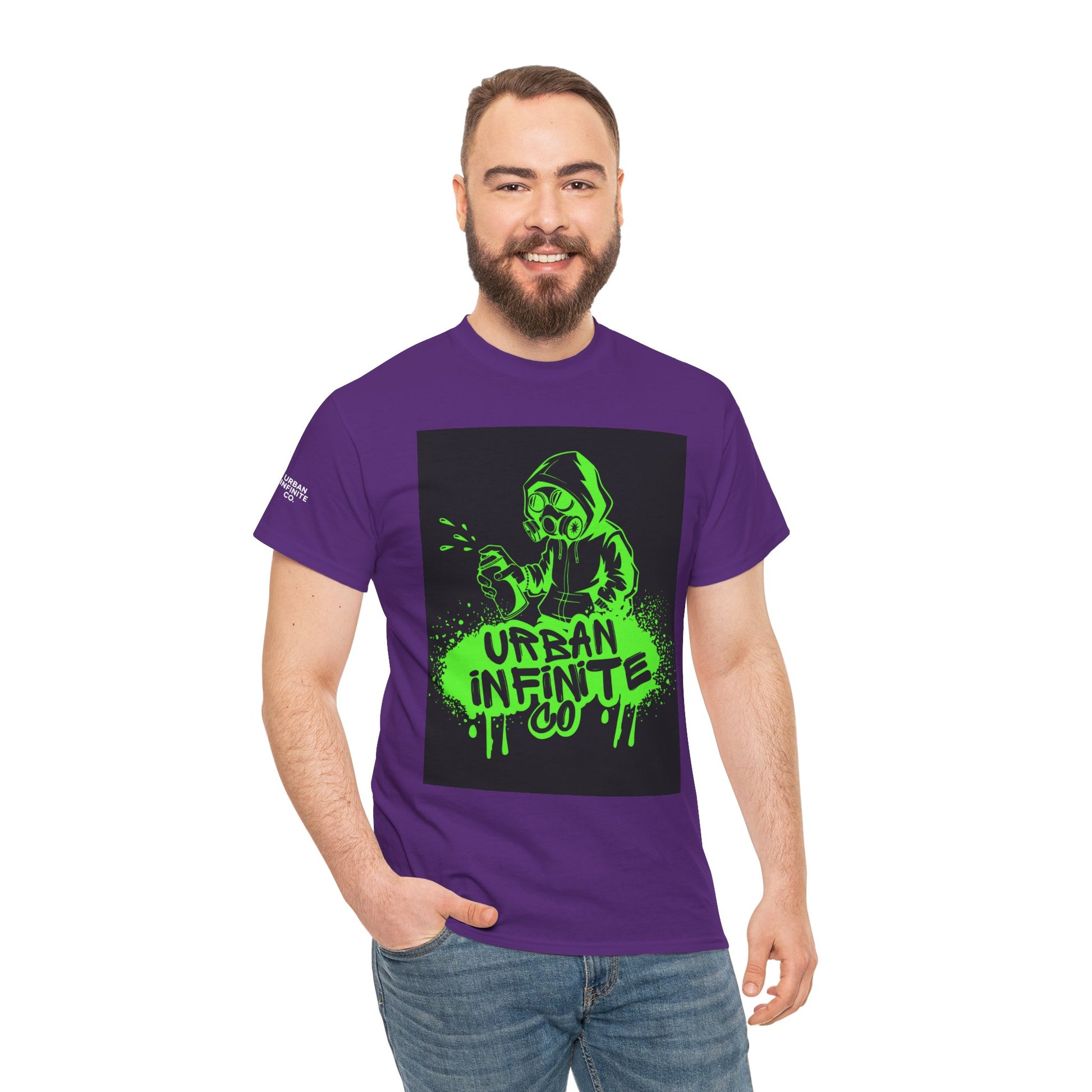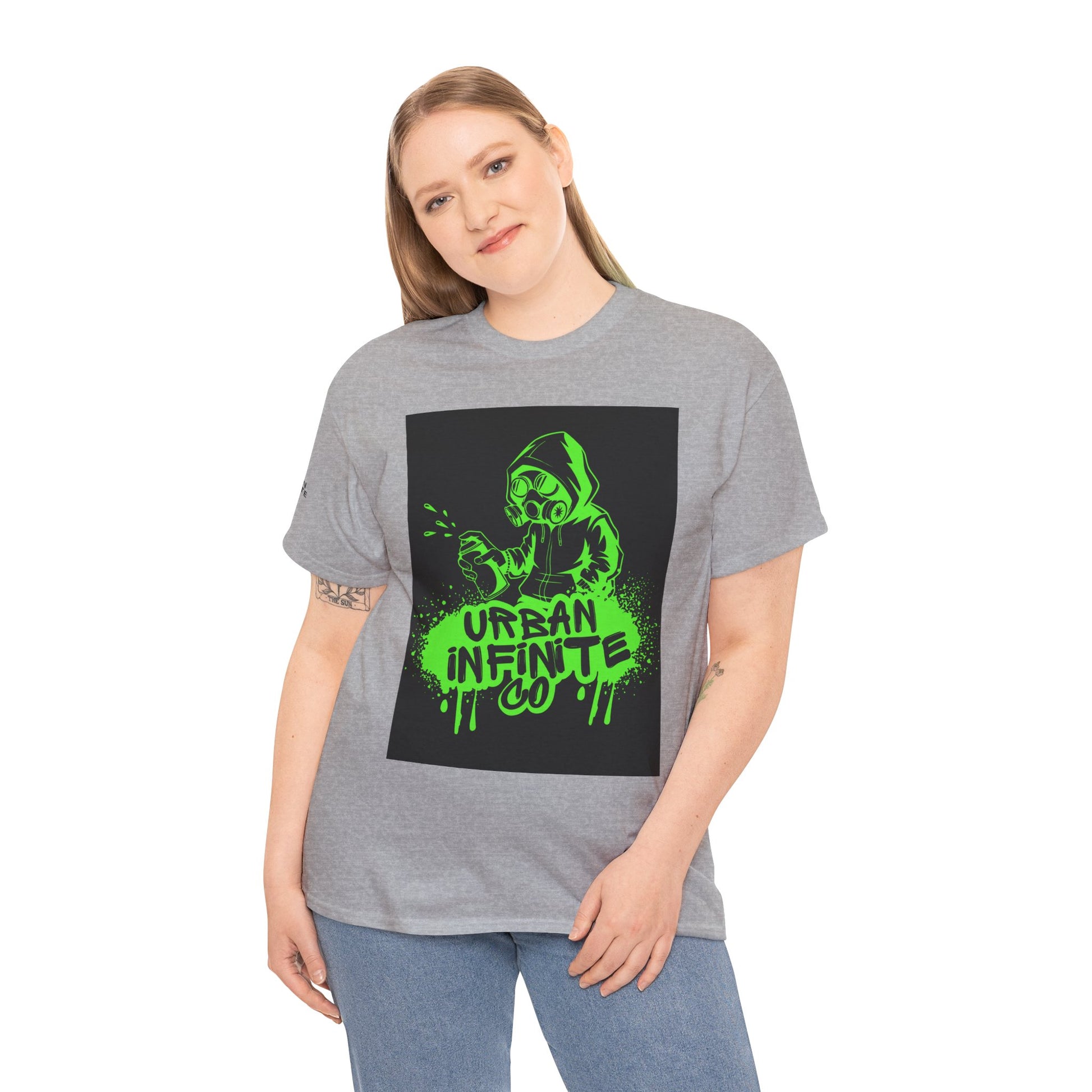 A bold, streetwise tee that speaks in neon. The crisp white cotton holds a high-contrast graphic: a hooded figure spraying vivid green graffiti that reads “Urban Infinite Co.” It feels like a late-night city pulse — the hiss of a can, wet paint dripping down brick, adrenaline and creativity in one frame. Wear it to stake your claim on skate spots, to add attitude under a denim jacket, or to stand out at underground art nights. The medium-weight fabric and relaxed crew fit let the design do the talking while staying comfortable through long days and late sessions.