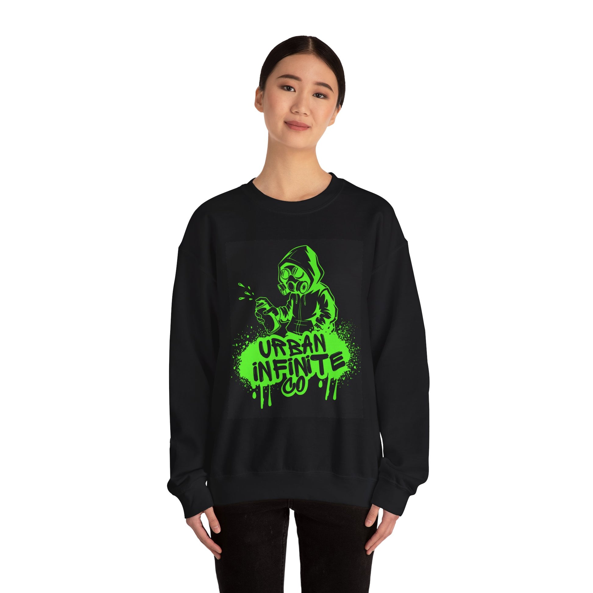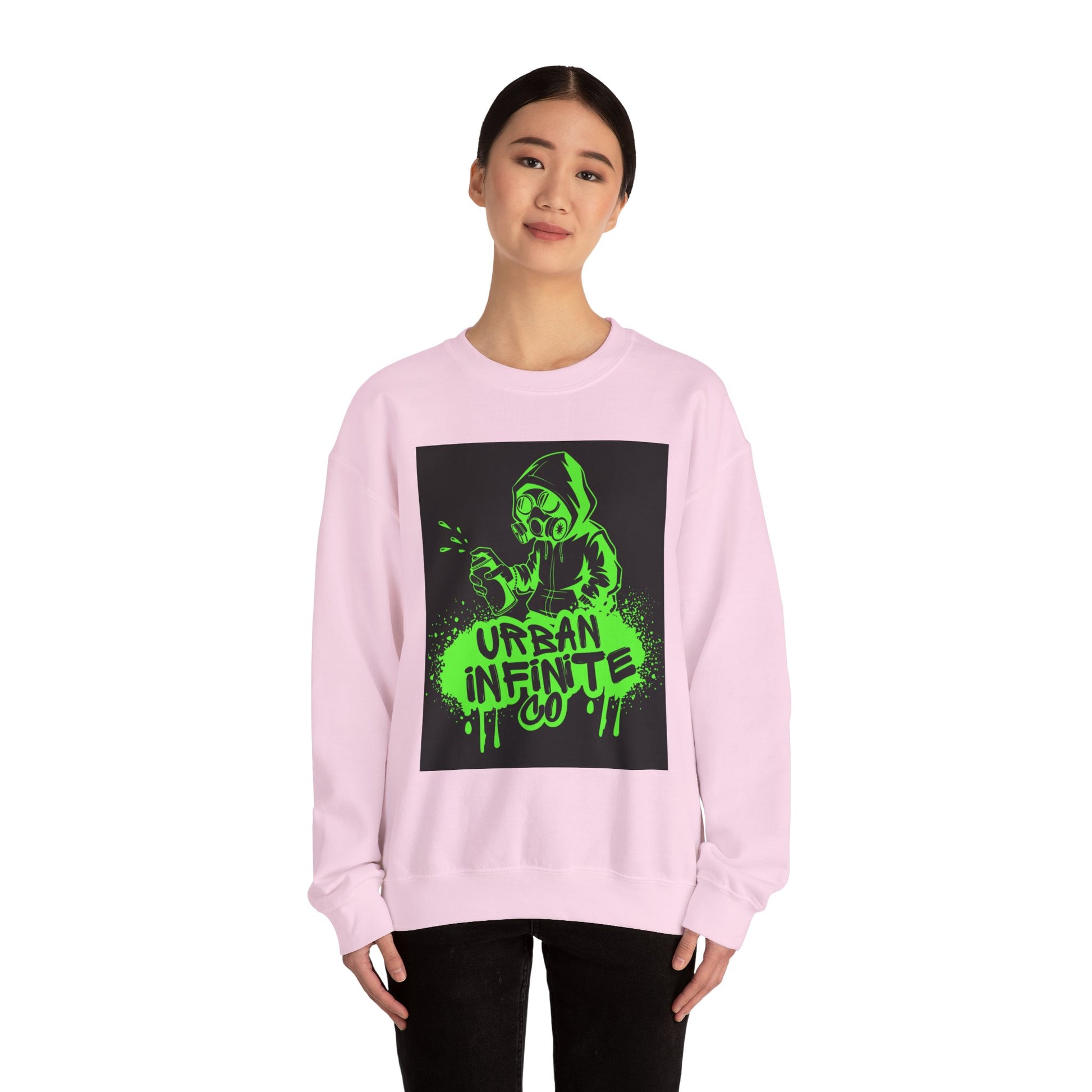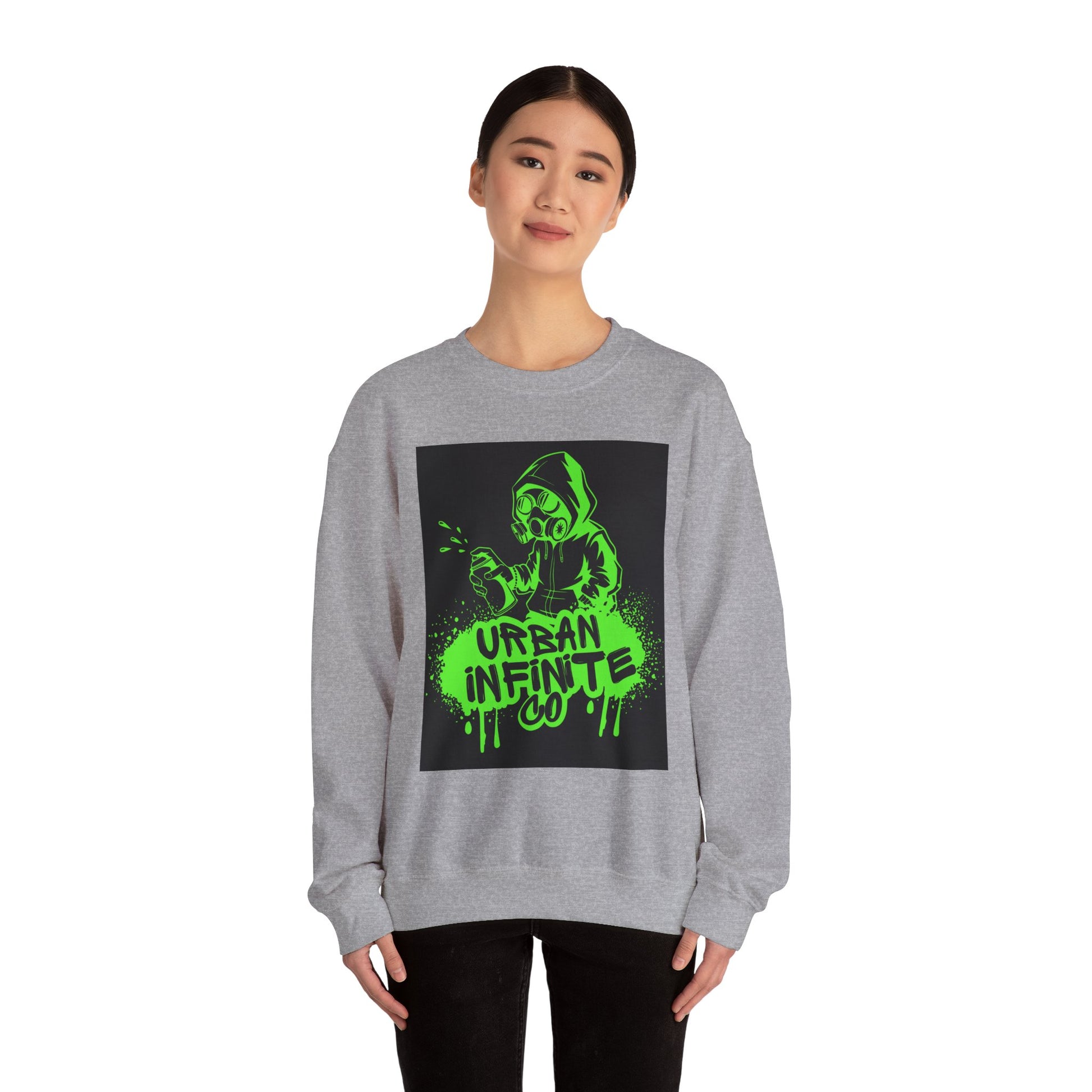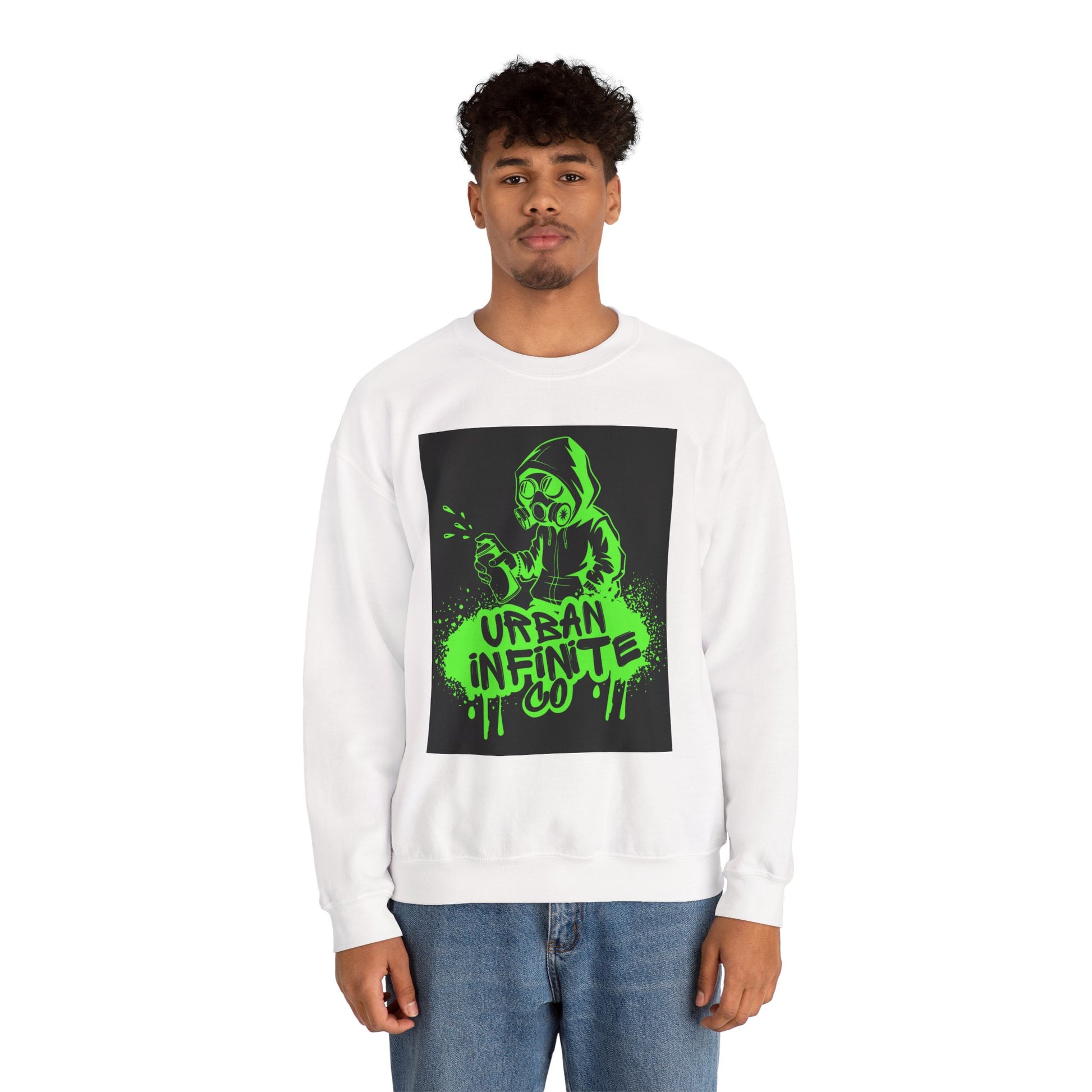 This midweight crewneck sweatshirt brings streetwise attitude without sacrificing comfort. The bold neon-green graffiti-style print — a hooded character spraying ‘Urban Infinite Co’ — sits on a clean white backdrop for high contrast and instant visual impact. The classic fit and crew neckline drape easily over layers, while double-needle stitching and a tear-away label keep wear comfortable and long-lasting. Ethically sourced cotton and OEKO-TEX certified dyes make it a responsible pick for everyday wear. Wear it to skate sessions, late-night walks, or when you want your outfit to speak with attitude.