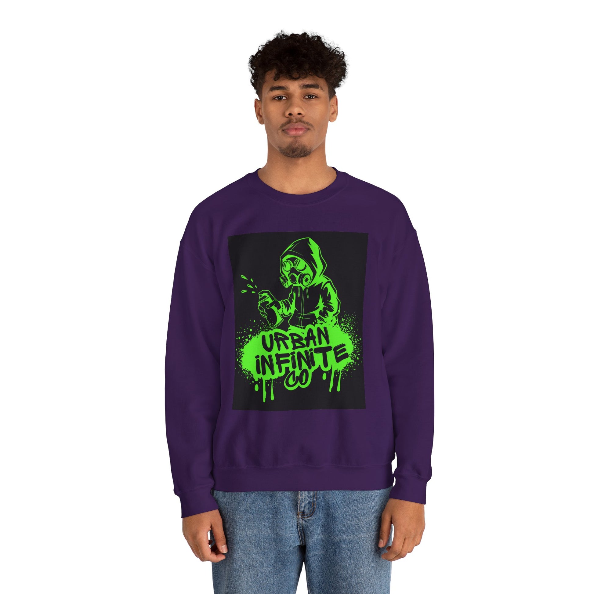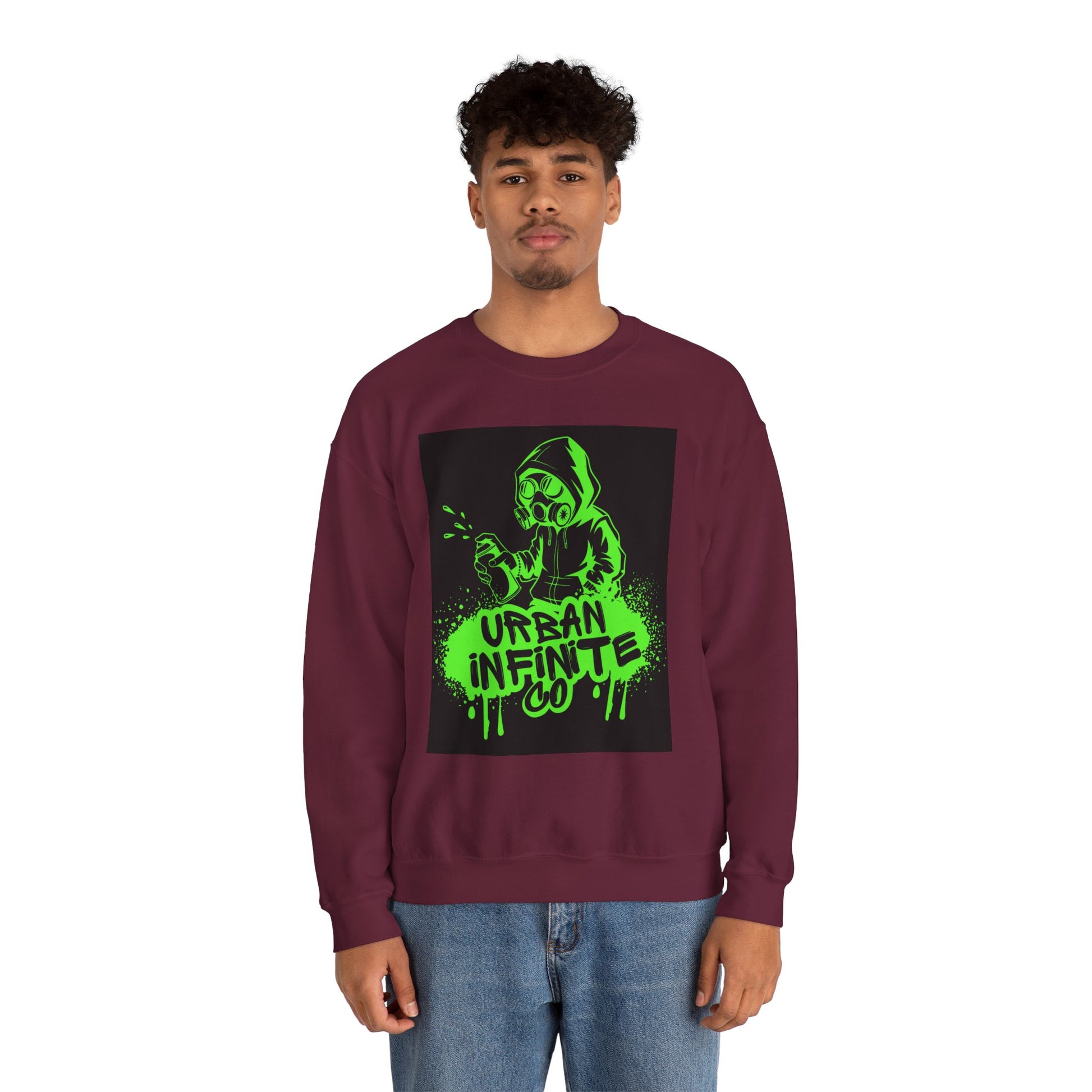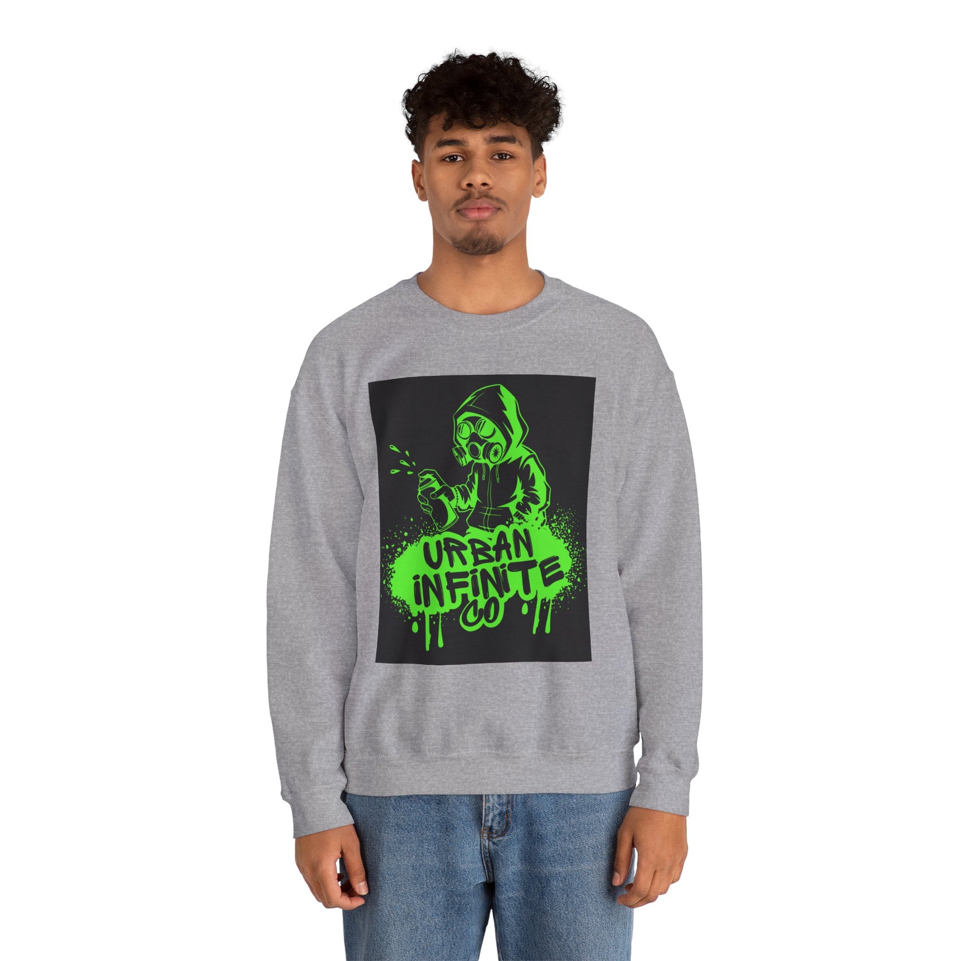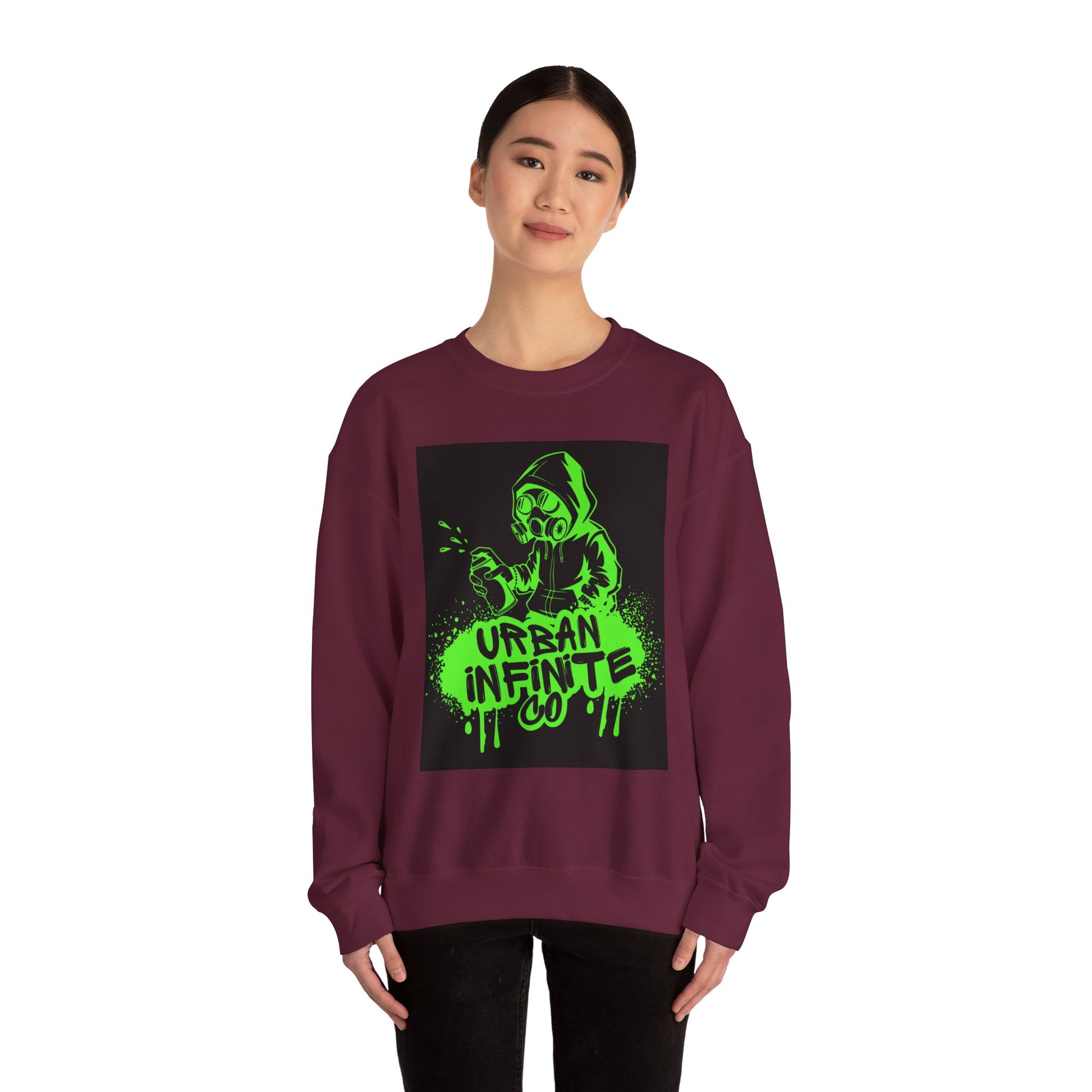 This midweight crewneck sweatshirt brings streetwise attitude without sacrificing comfort. The bold neon-green graffiti-style print — a hooded character spraying ‘Urban Infinite Co’ — sits on a clean white backdrop for high contrast and instant visual impact. The classic fit and crew neckline drape easily over layers, while double-needle stitching and a tear-away label keep wear comfortable and long-lasting. Ethically sourced cotton and OEKO-TEX certified dyes make it a responsible pick for everyday wear. Wear it to skate sessions, late-night walks, or when you want your outfit to speak with attitude.
