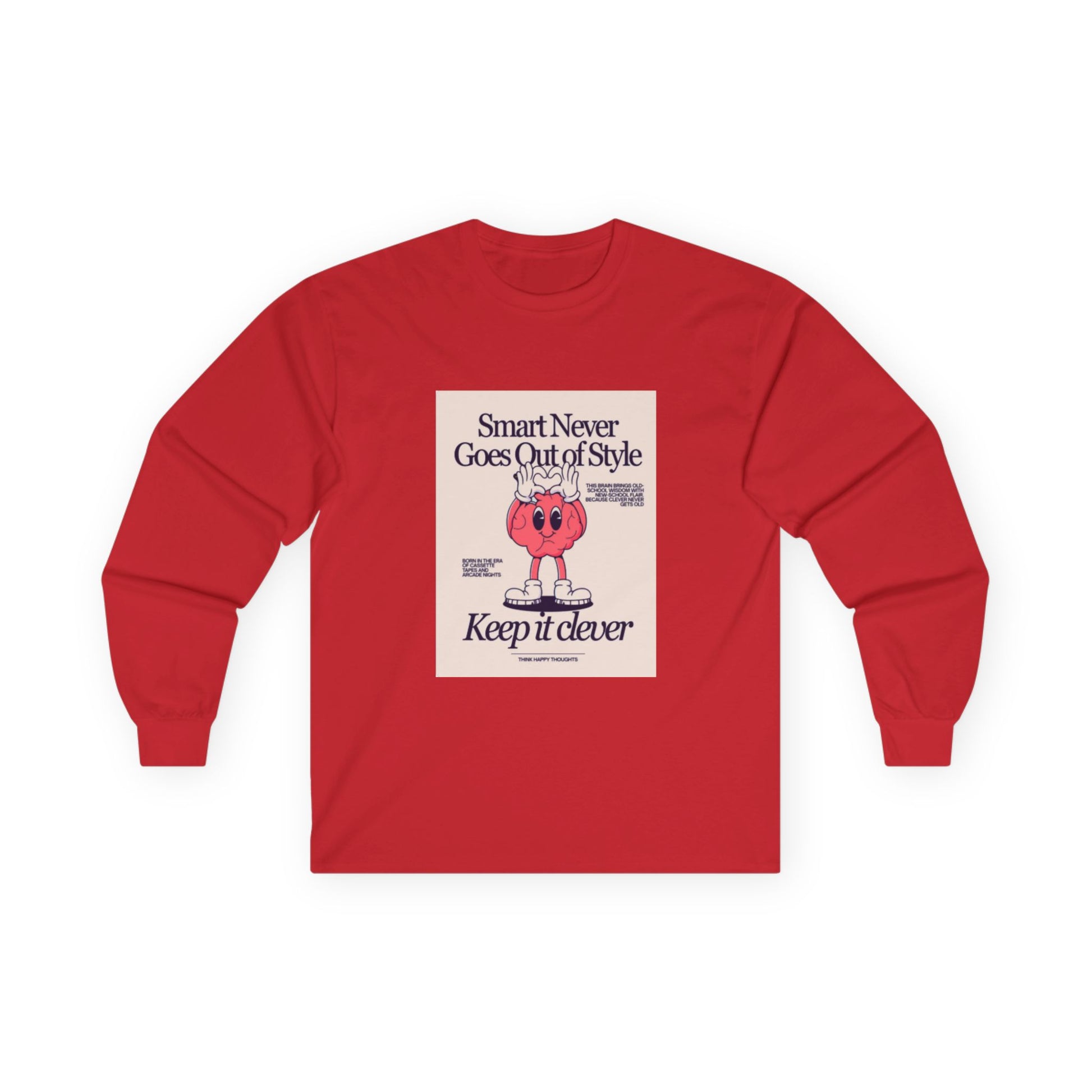 A soft, vintage-feel long sleeve that wears like an easy companion. The front art shows a playful, retro-inspired heart character with the tagline “Smart Never Goes Out of Style — Keep it clever,” giving the tee a nostalgic, witty vibe. Lightweight but substantial, the fabric has a slightly thicker, classic hand that drapes well and holds its shape. Sleeve cuffs and a ribbed collar keep the silhouette tidy, while the tubular knit construction and shoulder tape mean fewer seams and a cleaner finish. It’s the kind of long sleeve you reach for on slow mornings, bookstore afternoons, or when you want your outfit to whisper personality instead of shout it.