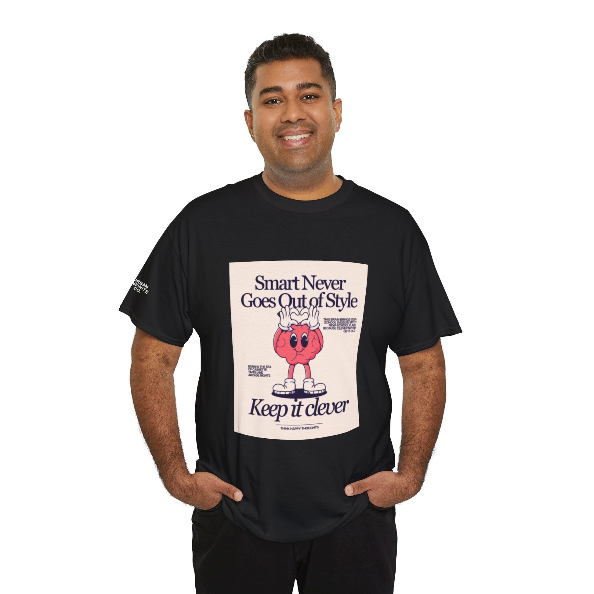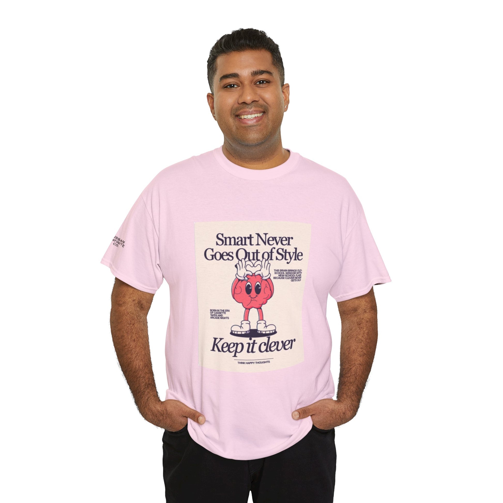 A relaxed, vintage-inspired tee that wears like a favorite from day one. The front shows a playful retro illustration and the tagline 'Smart Never Goes Out of Style — Keep it clever,' giving the shirt a clever, nostalgic voice without trying too hard. The medium-weight 100% cotton body (natural tone shows subtle flecks) and ribbed crew neck hold shape while the tubular knit construction keeps the silhouette clean and simple. Little details — a printed sleeve emblem and a soft tear-away label — make it comfortable and lived-in. Wear it with faded jeans, under a chore jacket, or layered with a knit for cool mornings. It’s the kind of shirt that quietly signals taste: thoughtful, slightly cheeky, and down-to-earth.